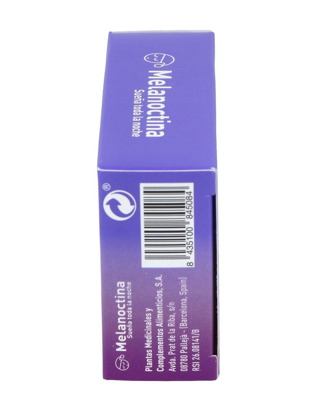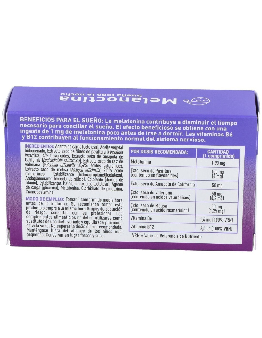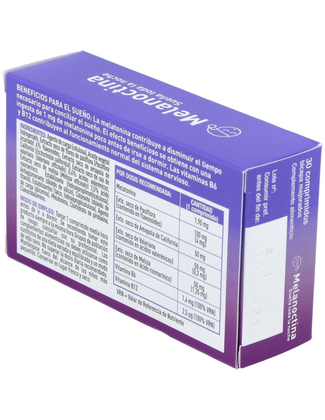 Ingredientes:Agente de carga (celulosa), Aceite vegetal hidrogenado, Extracto seco de flores de pasiflora (Passiflora incarnata) 4% flavonoides. Extracto seco de amapola de California (Eschscholzia californica), Extracto seco de raíz de valeriana (Valeriana officinalis) 0,4% ácidos valerénicos, Extracto seco de melisa (Melissa officinalis) 2,5% ácido rosmarínico, Estabilizante (hidroxipropilmetilcelulosa), Antiaglomerante (dióxido de silicio), Colorante (dióxido de titanio), Estabilizantes (talco, hidroxipropilcelulosa), Agente de carga (glicerina), Melatonina, Cloridrato de piridoxina, Cianocobalamina.Modo de empleo:Toma 1 comprimido al día media hora antes de ir a dormir. Aunque Melanoctina es segura para la mayoría, recomendamos consultar a un médico si estás embarazada, en periodo de lactancia o tomando medicamentos. Evita su uso junto con sedantes para prevenir excesiva somnolencia.Presentación:Envase de 30 comprimidos.
