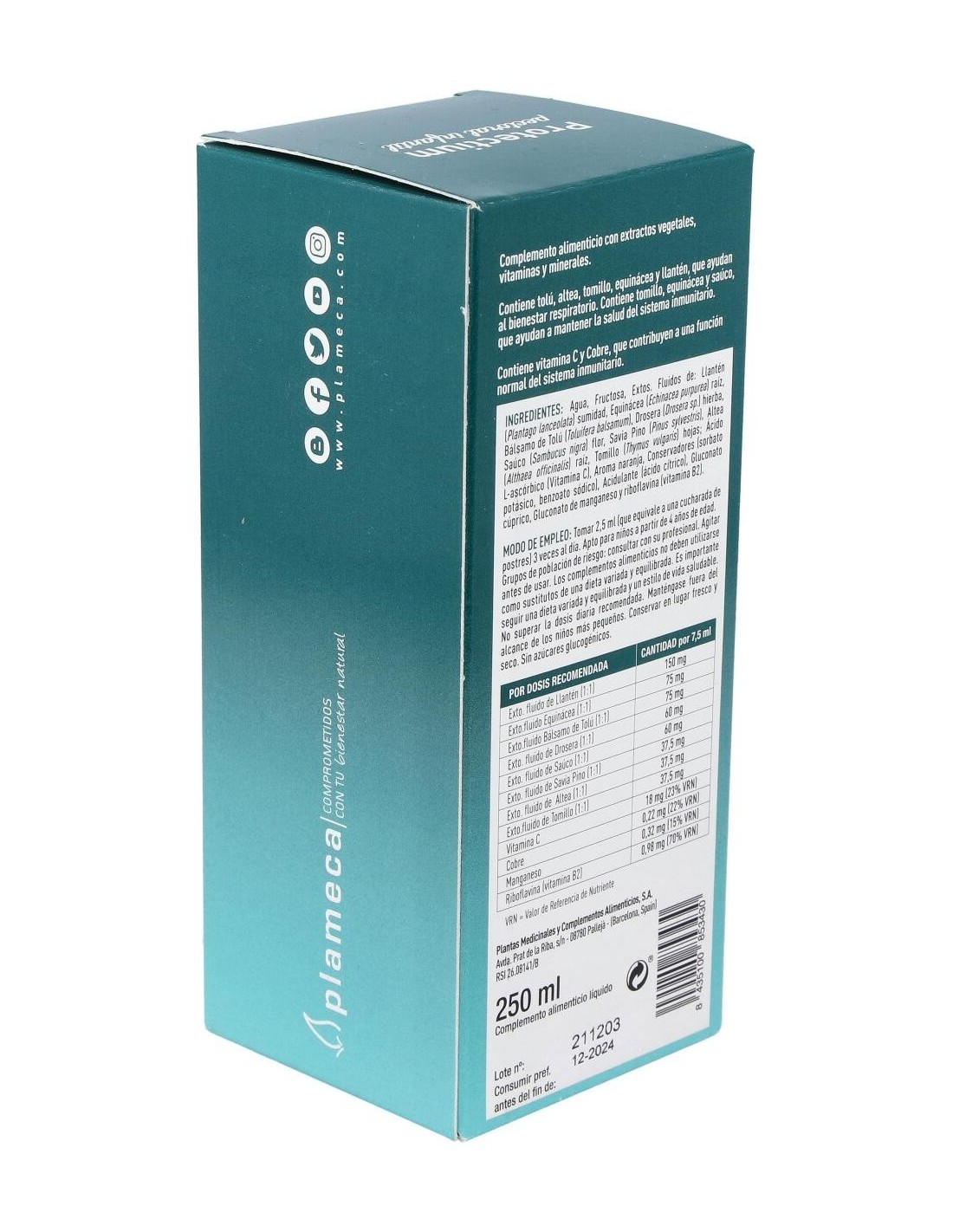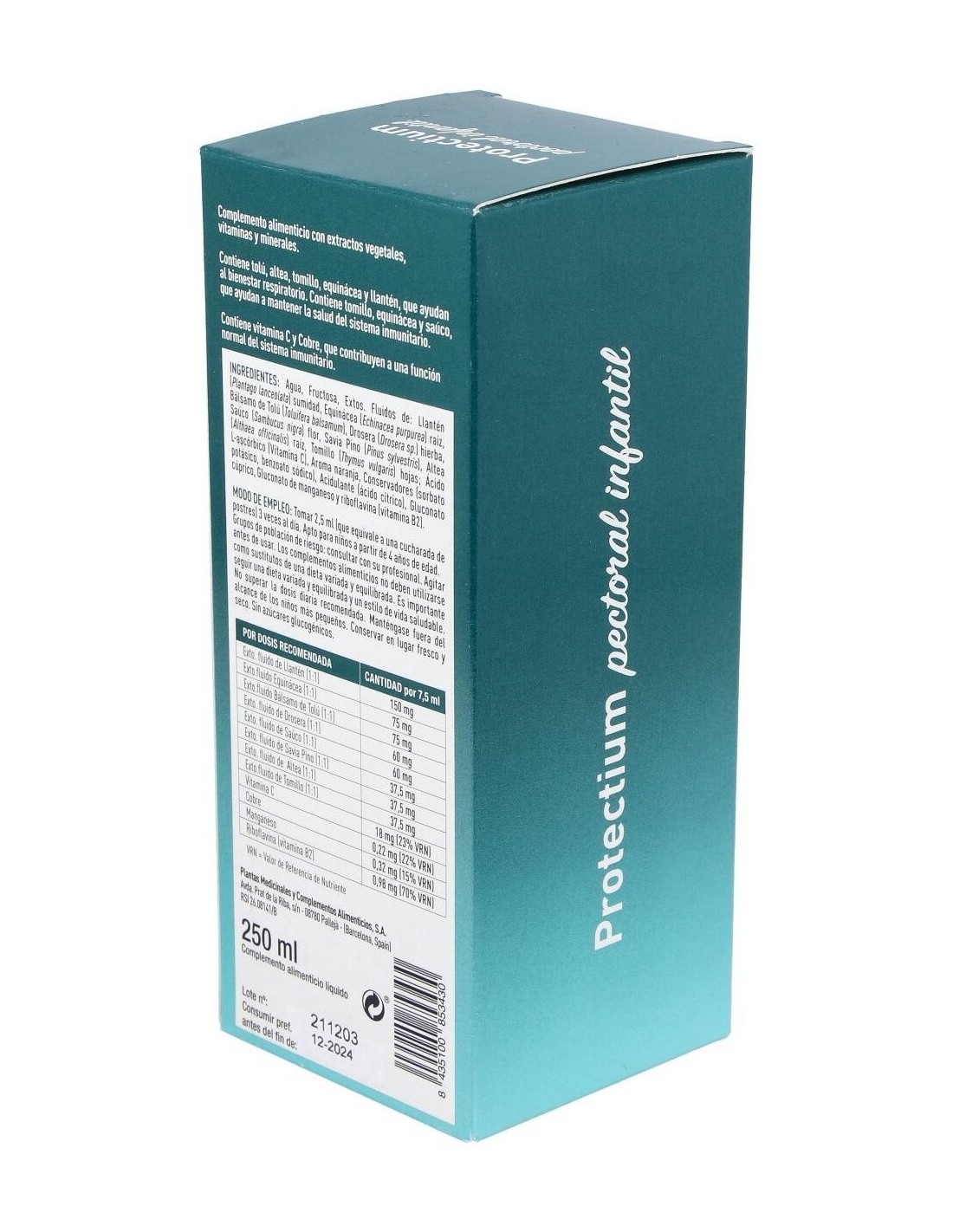 Ingredientes:Agua, Fructosa, Extos. Fluidos de: Llantén (Plantago lanceolata) sumidad, Equinácea (Echinacea purpurea) raíz, Bálsamo de Tolú (Toluifera balsamum), Drosera (Drosera sp.) hierba, Saúco (Sambucus nigra) flor, Savia Pino (Pinus sylvestris), Altea (Althaea officinalis) raíz, Tomillo (Thymus vulgaris) hojas; Ácido L-ascórbico (Vitamina C), Aroma naranja, Conservadores (sorbato potásico, benzoato sódico), Acidulante (ácido cítrico), Gluconato cúprico, Gluconato de manganeso y Riboflavina (vitamia B2).Modo de empleo:Tomar 2,5 ml 3 veces al día. Apto para niños a partir de 6 años de edad.Presentación:Envase de 250 ml.
