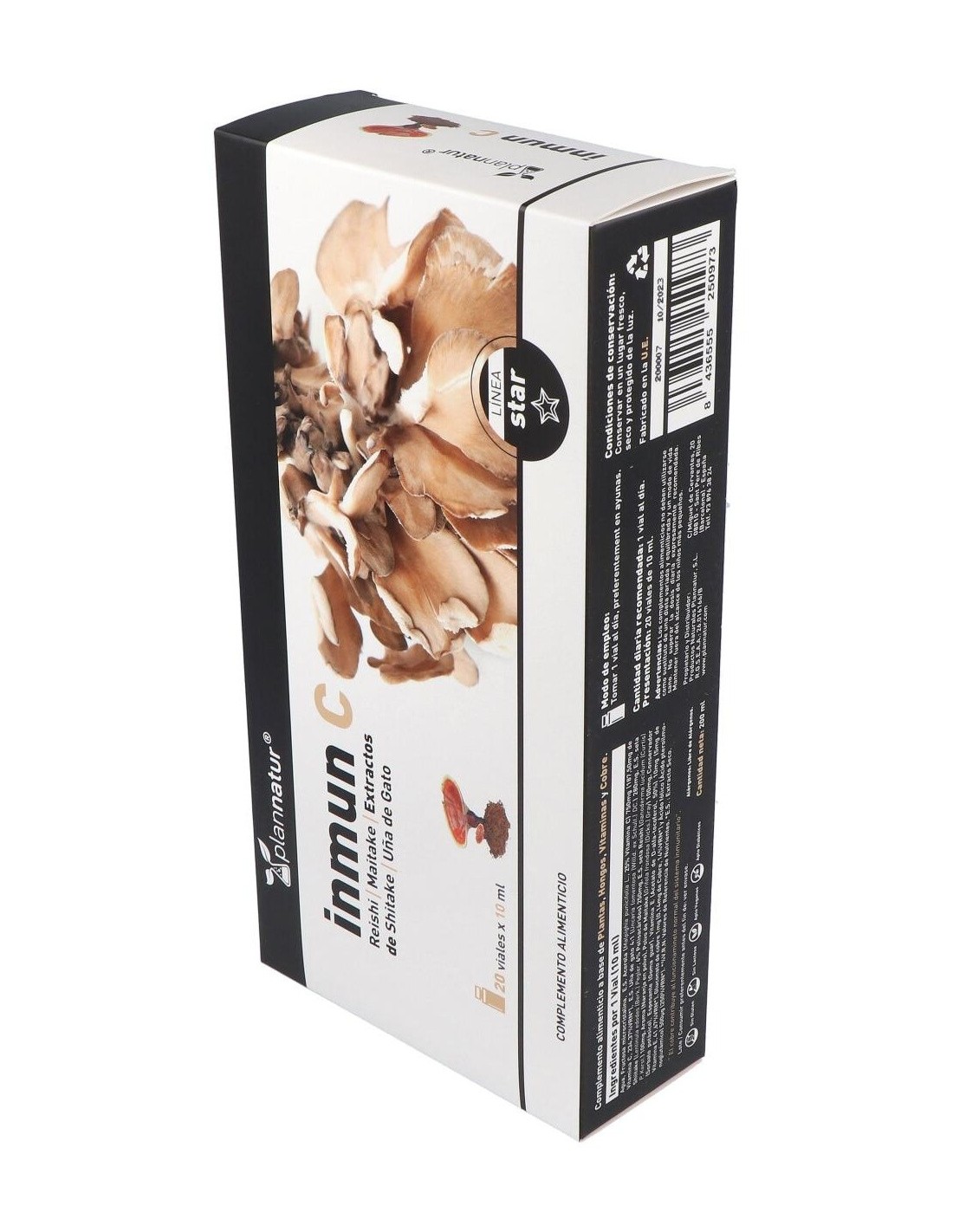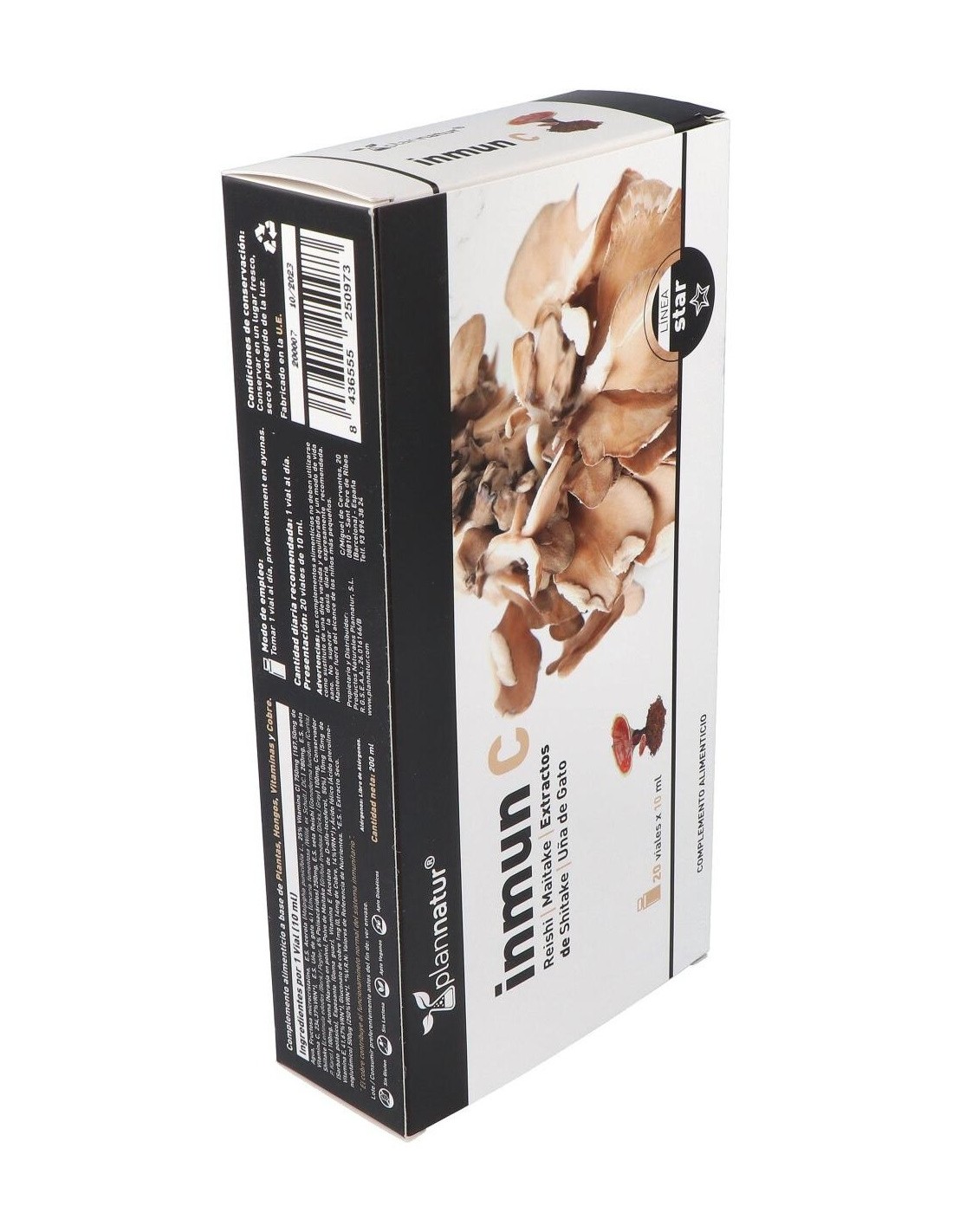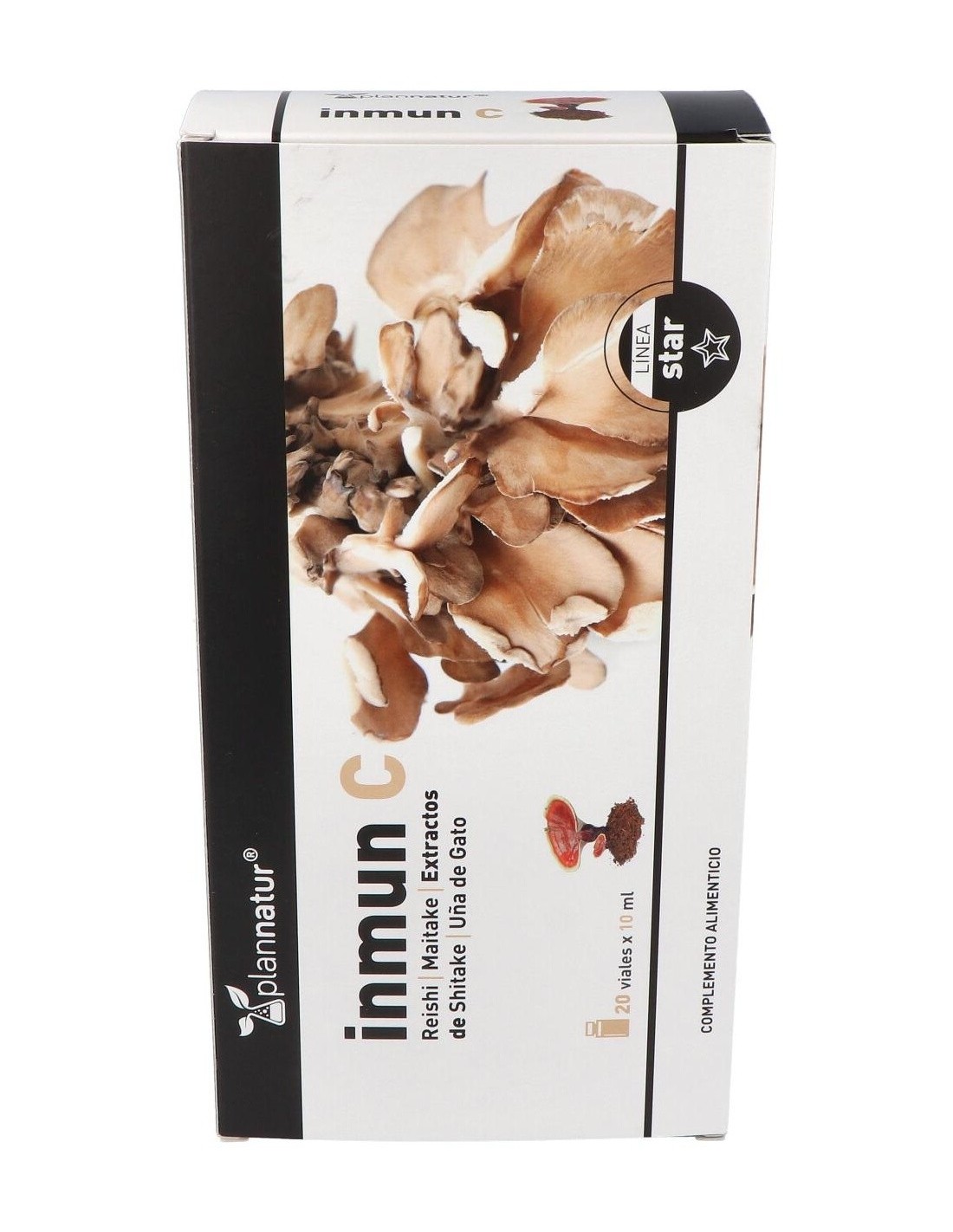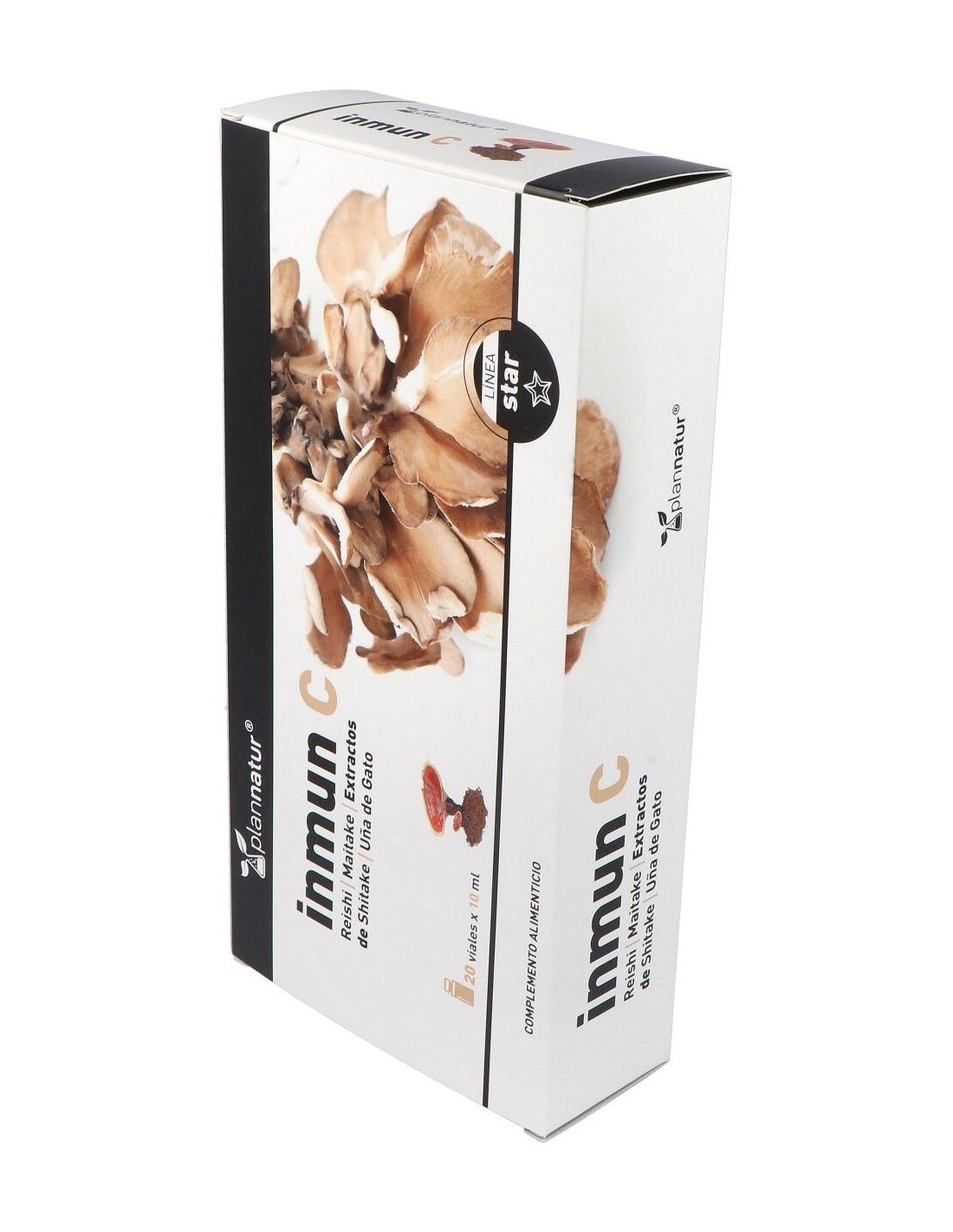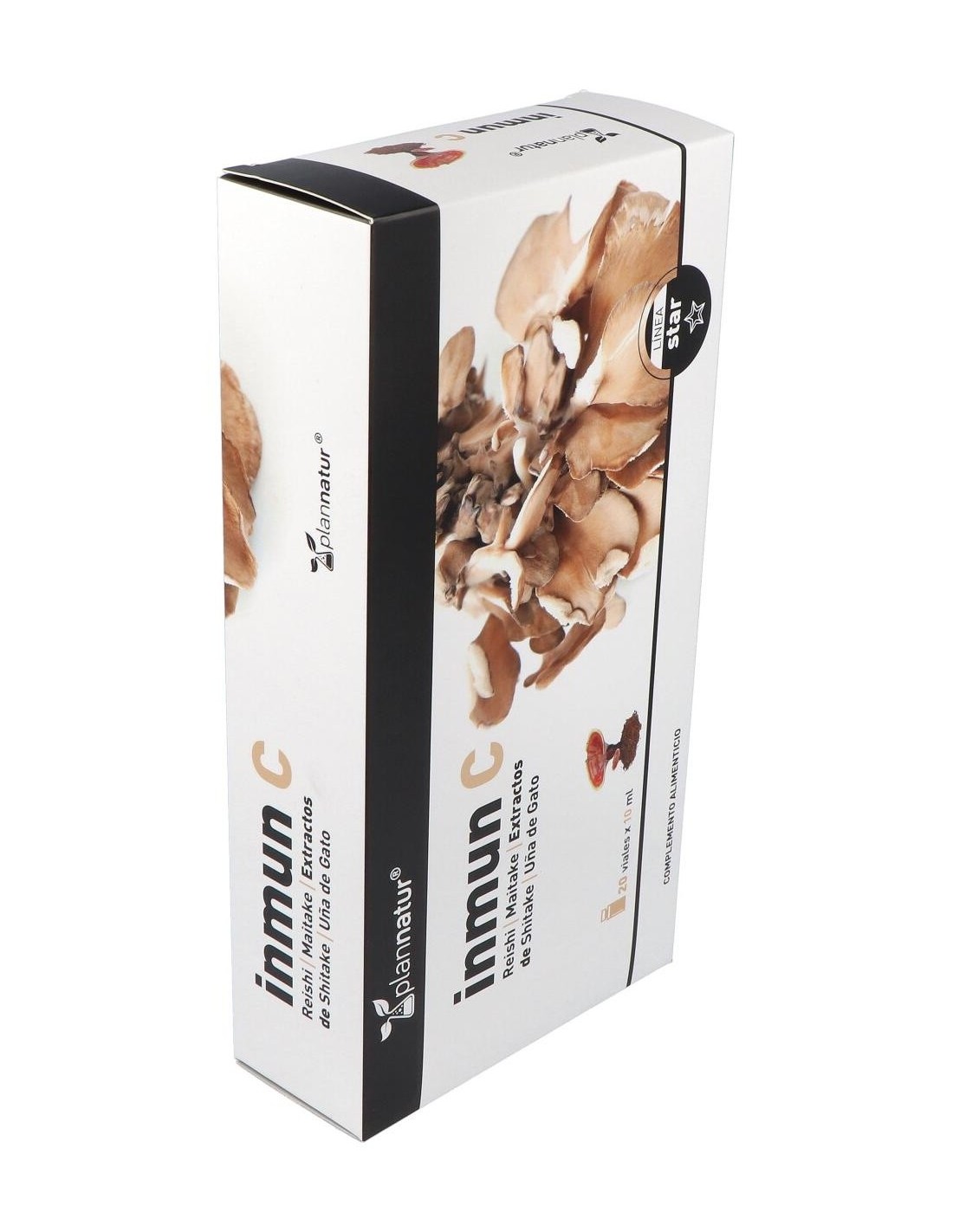 Complemento alimenticio en forma de ampollas bebibles, elaborado a base de extractos de la planta """"uña de gato"""" y de hongos reishi, shiitake y maitake, además de vitamina C y cobre, que contribuye a estimular y reforzar las defensas del sistema inmunitario. Contiene además vitamina B9, que ayuda a disminuir la sensación de cansancio.