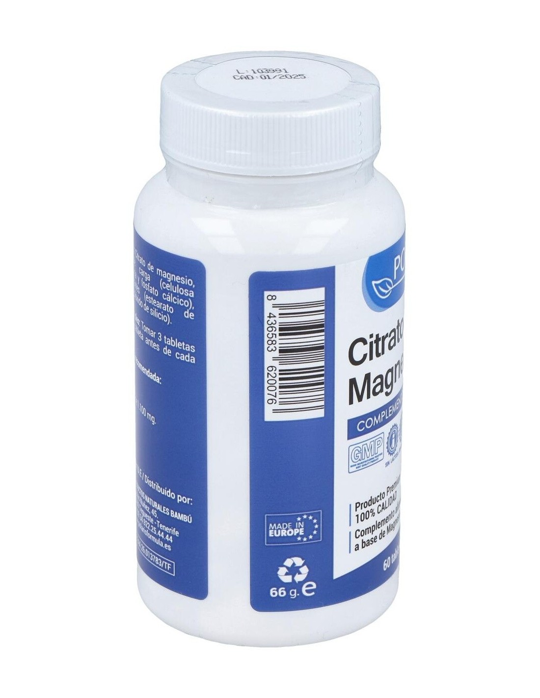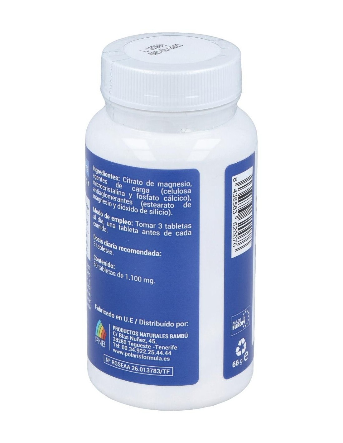 POLARISComposición activa por comprimido:600 mg de citrato de magnesio.Ingredientes:Citrato de magnesio, agentes de carga (celulosa microcristalina, fosfato