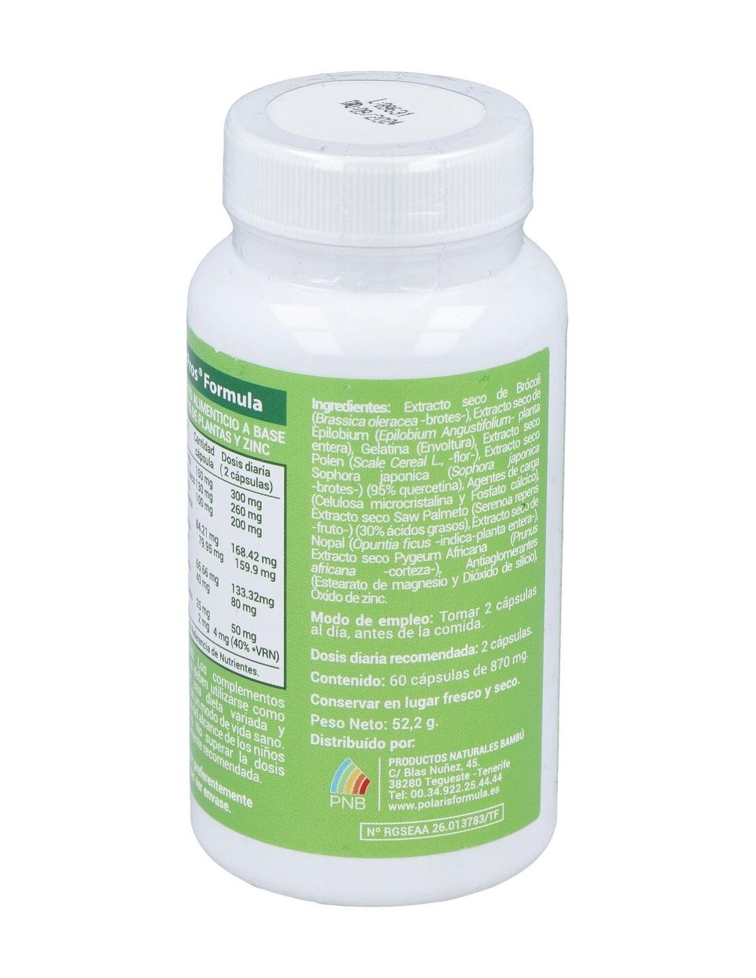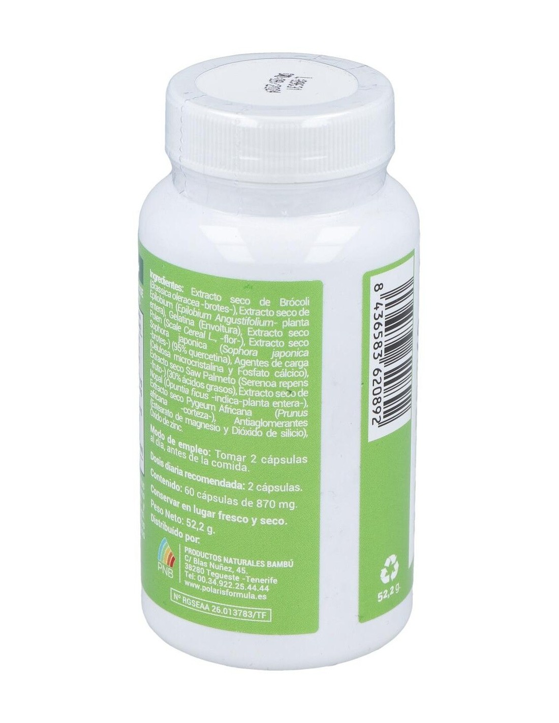Complemento alimenticio formulado a base de zinc y extractos secos de brócoli, sophora japónica y polen. Rico en vitaminas, fibra y betacarotenos. Contribuye al funcionamiento normal de la próstata. A sus ingredientes se le atribuyen propiedades drenantes y antiinflamatorias. Indicado para hombres.