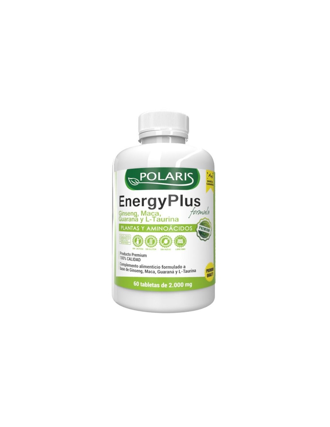 Ingredientes:Agente de carga (celulosa microcristalina), extracto seco de ginseng (Panax ginseng C.A.Mey -hojas y tallos-) (20% gingenósidos), extracto seco de maca (Lepidium meyenii walp -raíz-) 4:1, extracto seco de guaraná (Paullinia cupana kunth -semillas-) (12% cafeína), L-taurina, antiaglomerantes (estearato de magnesio, dióxido de silicio).Modo de empleo:Tomar 2 comprimidos al día, preferentemente antes de la comida.Presentación:Envase de 60 comprimidos.Recomendaciones y advertencias:No contiene lactosa, gluten ni huevo. No GMO.