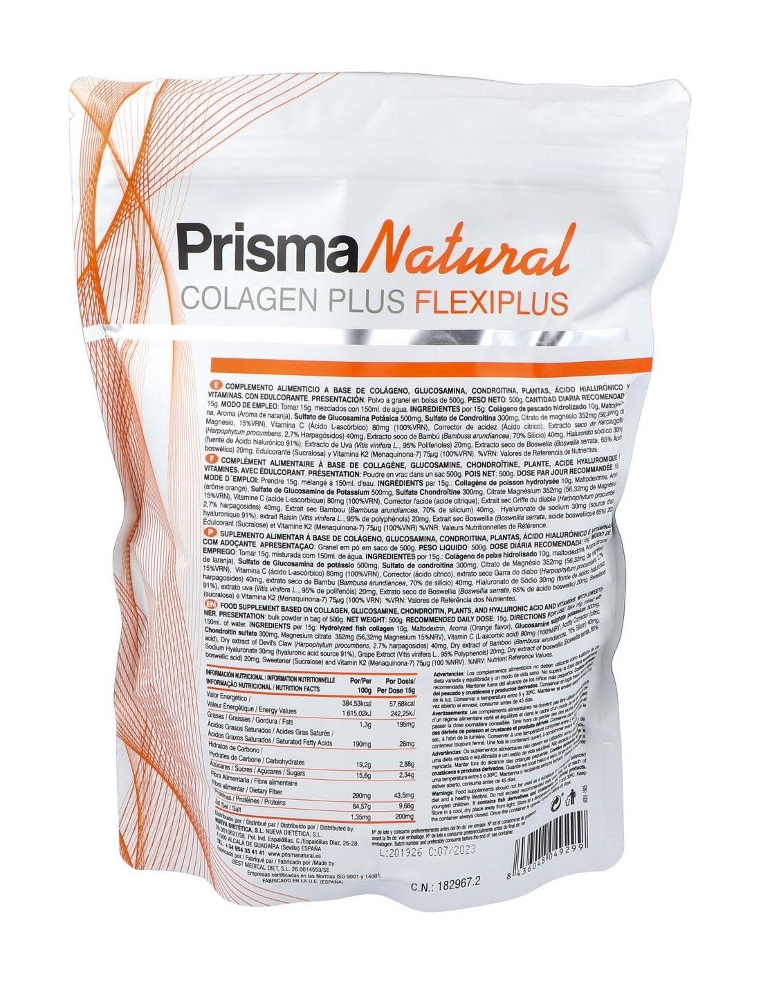 PRISMA NATURALPrisma Natural Colagen Plus Flexiplus nuevo formato ahorro de 500 g es el complemento ideal para fortalecer y regenerar las articulaciones además de ayudar a disminuir la inflamación y el dolor.Es un producto para el tratamiento y prevención de problemas articulares y osteomusculares, como artritis y artrosis e inflamación articular que curse con dolor.