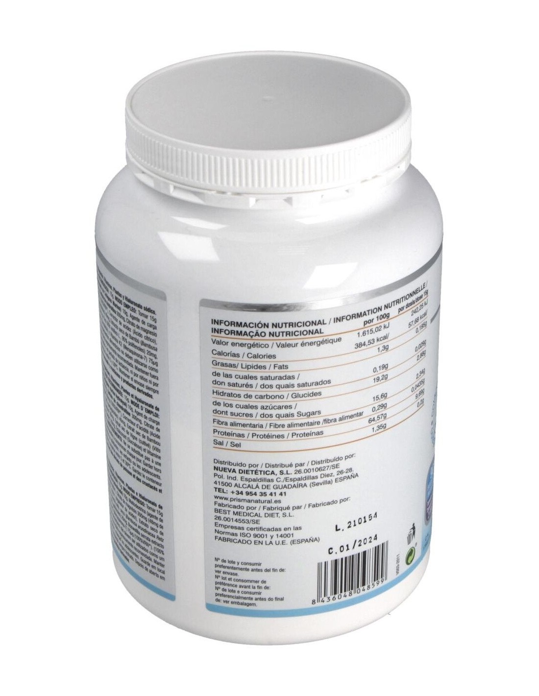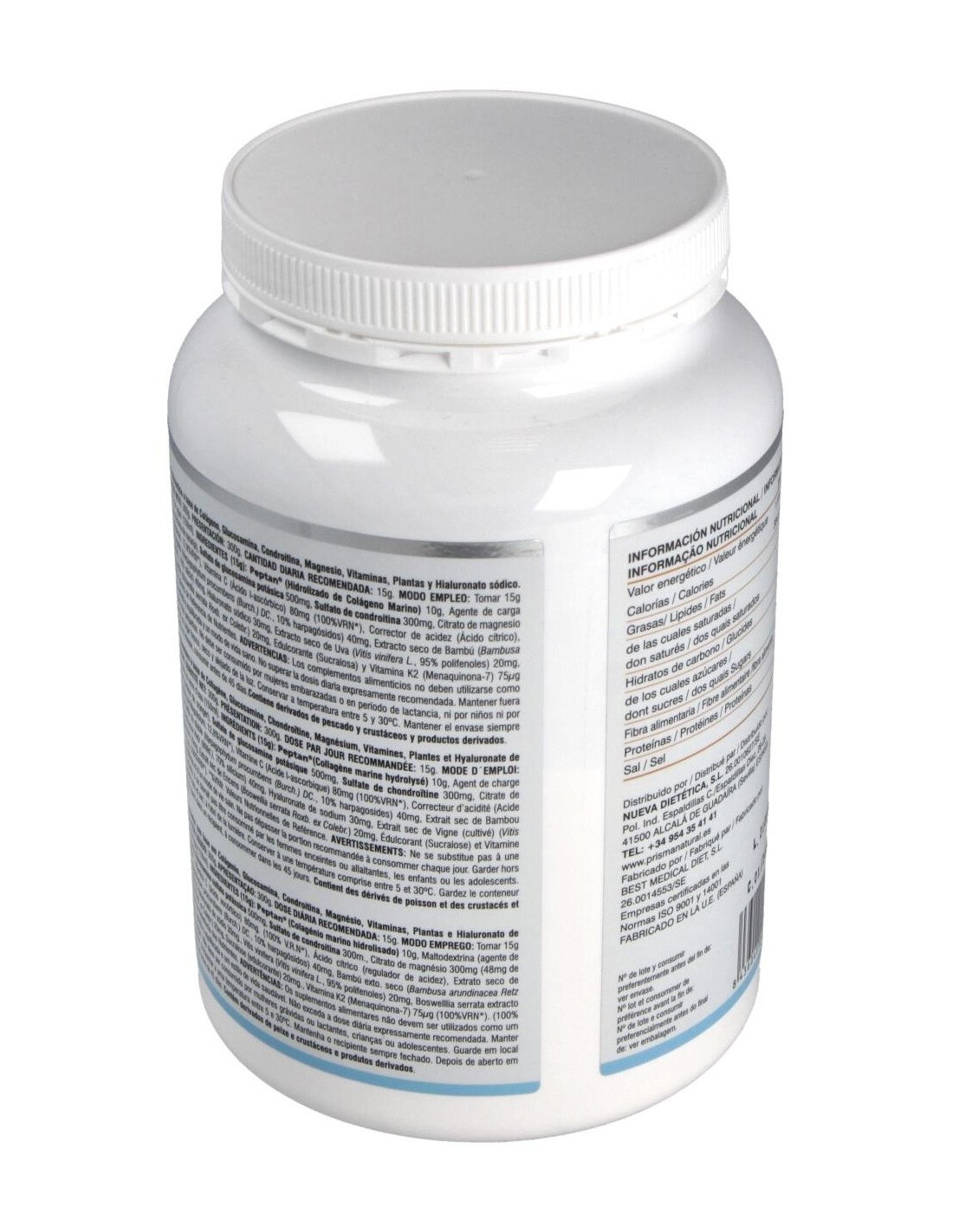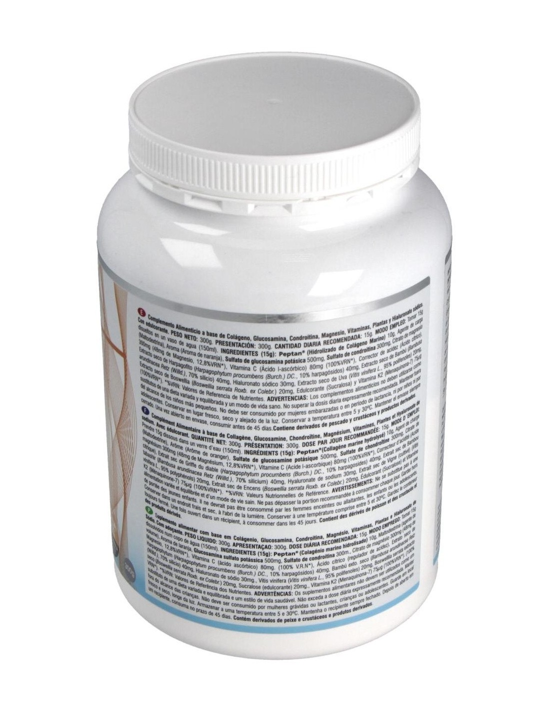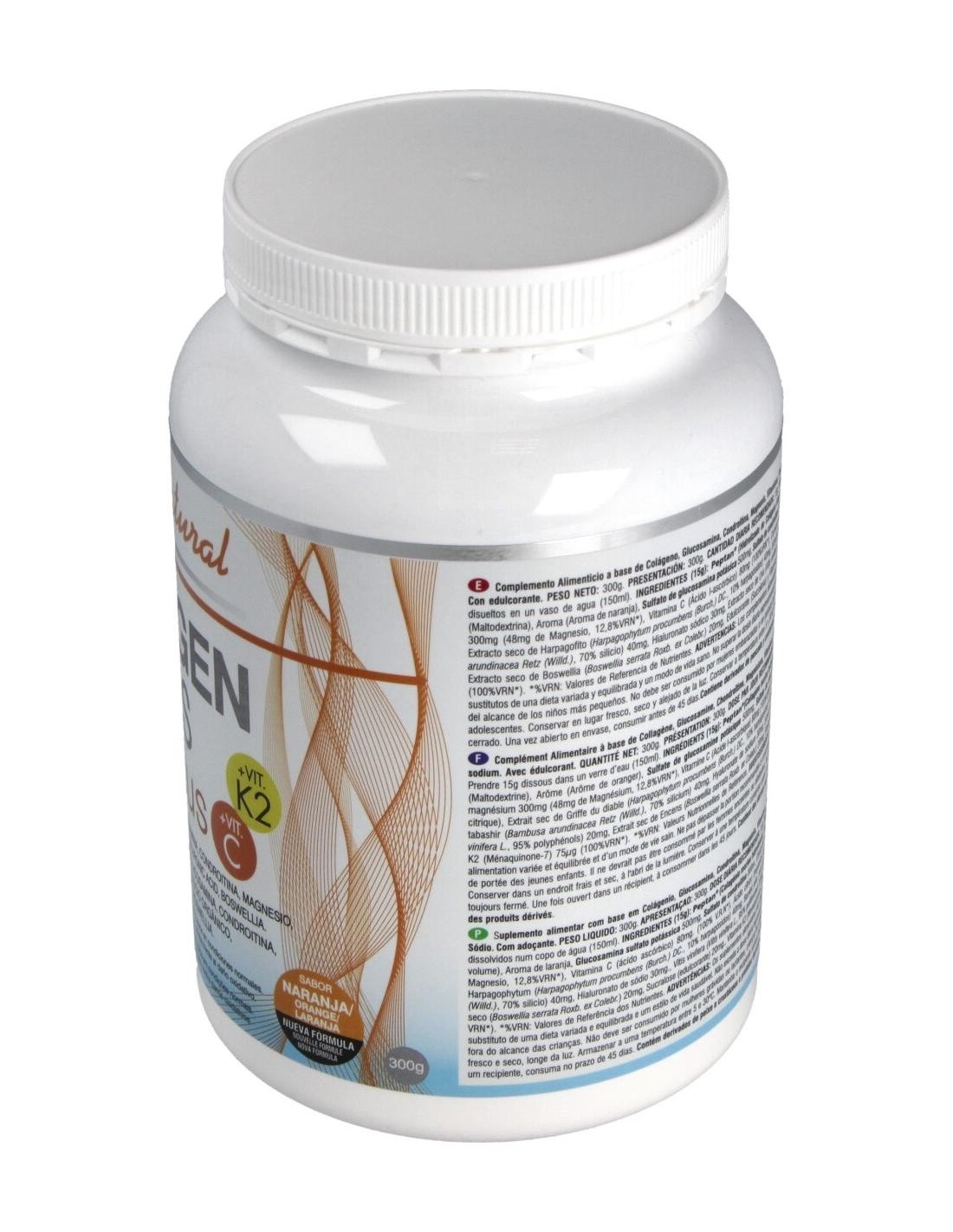 Hidrolizado de colágeno 10 g, agente de carga (maltodextrina), aroma de naranja, sulfato de glucosamina potásica 500 mg, sulfato de condroitina 300 mg, citrato de magnesio 300 mg (48 mg de magnesio), vitamina C (ácido l-ascórbico) 80 mg, corrector de acidez (ácido cítrico), extracto seco de harpagofito (2,7% harpagósidos) 40 mg, extracto seco de bambú (70% silicio) 40 mg, hialuronato sódico 30 mg, extracto seco de uva (95% polifenoles) 20 mg, extracto seco de boswellia 20 mg, edulcorante (sucralosa), vitamina K2 (menaquinona) 75 mcg.