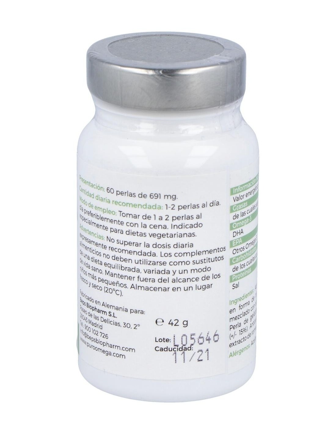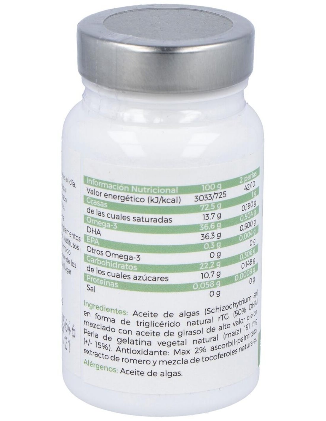 Aceite de algas (Schizochytrium sp) en forma de triglicérido natural rTH (50%) mezclado con aceite de girasol de alto valor oleico. Perla de Gelatina vegetal natural (maíz) 191 mg (+-15%). Antioxidante más 2% ascorbil-palmitato, extracto de romero y mezcla de tocoferoles naturales.