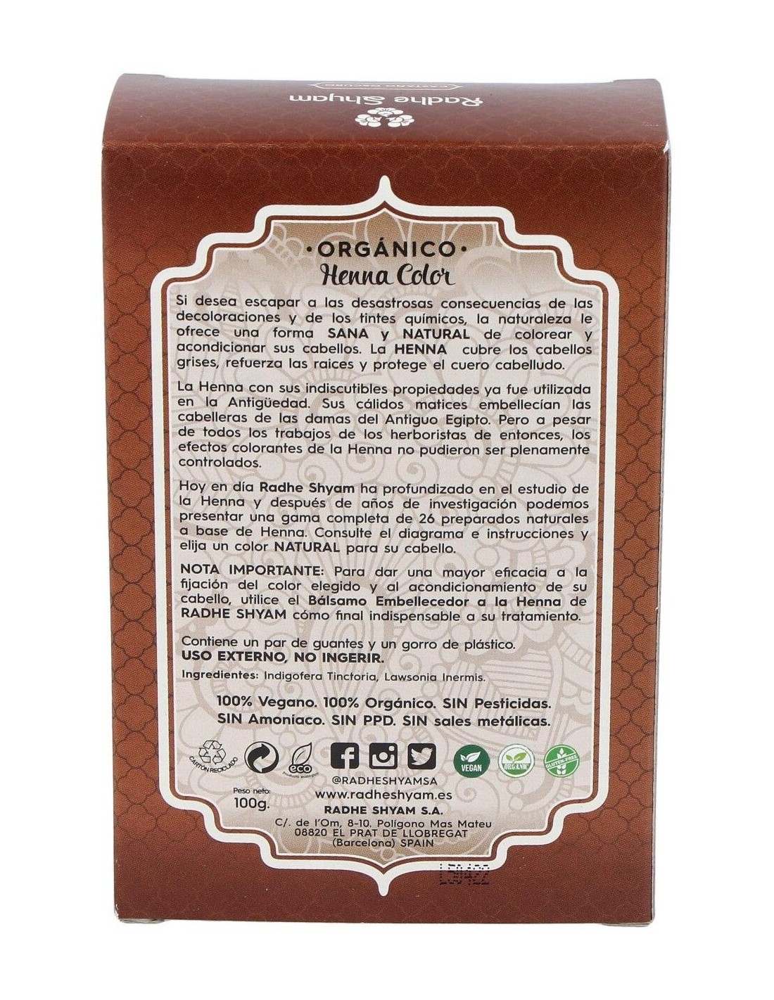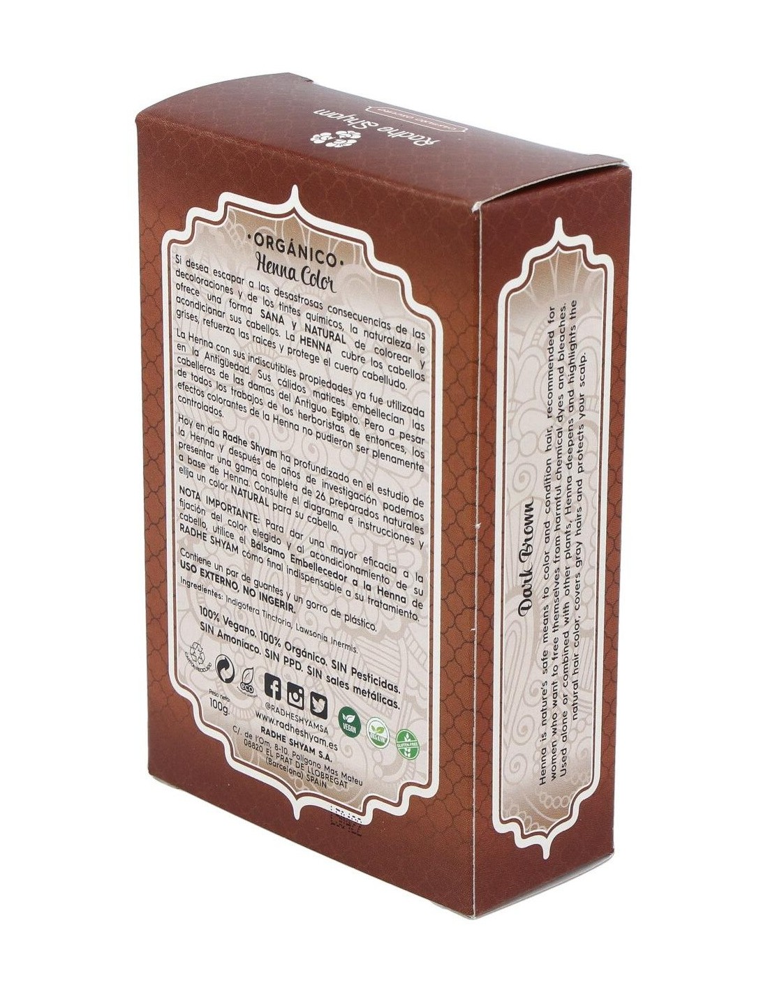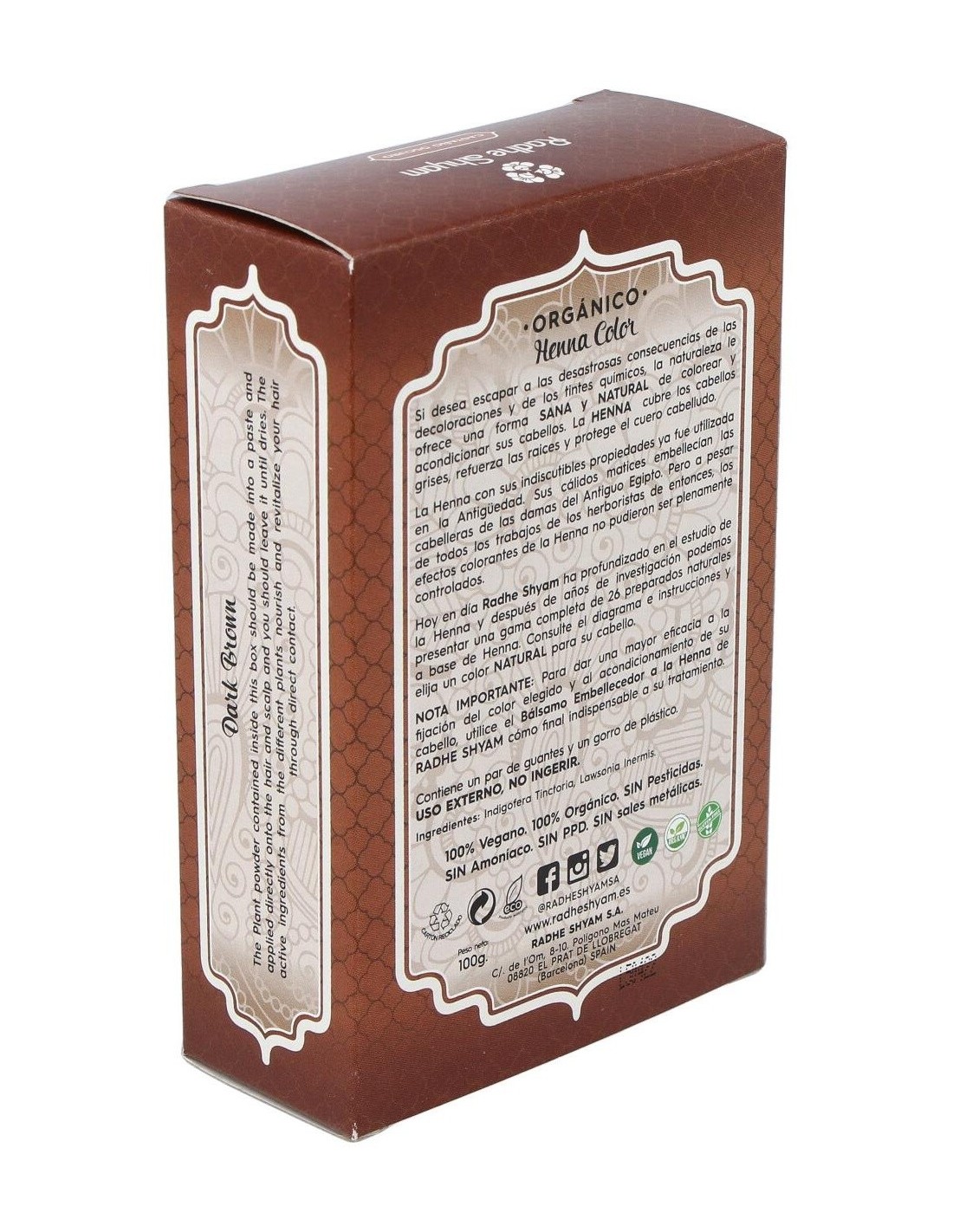 RADHE SHYAMTinte Natural para el pelo a base de plantas, que cuida y nutre la piel, del que se obtiene un color marrón oscuro. HENNA POLVO CASTAÑO OSCURO 100gr.