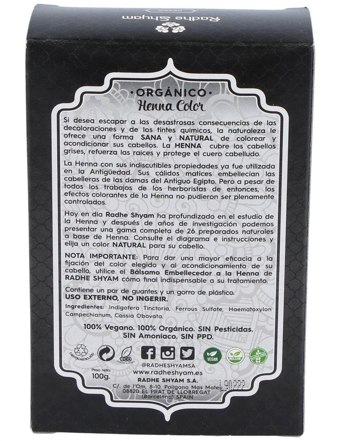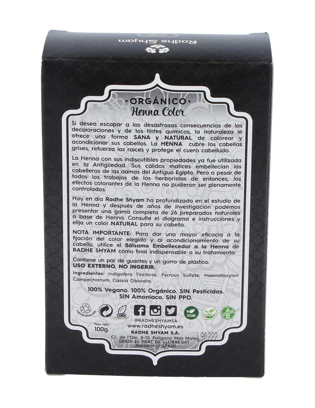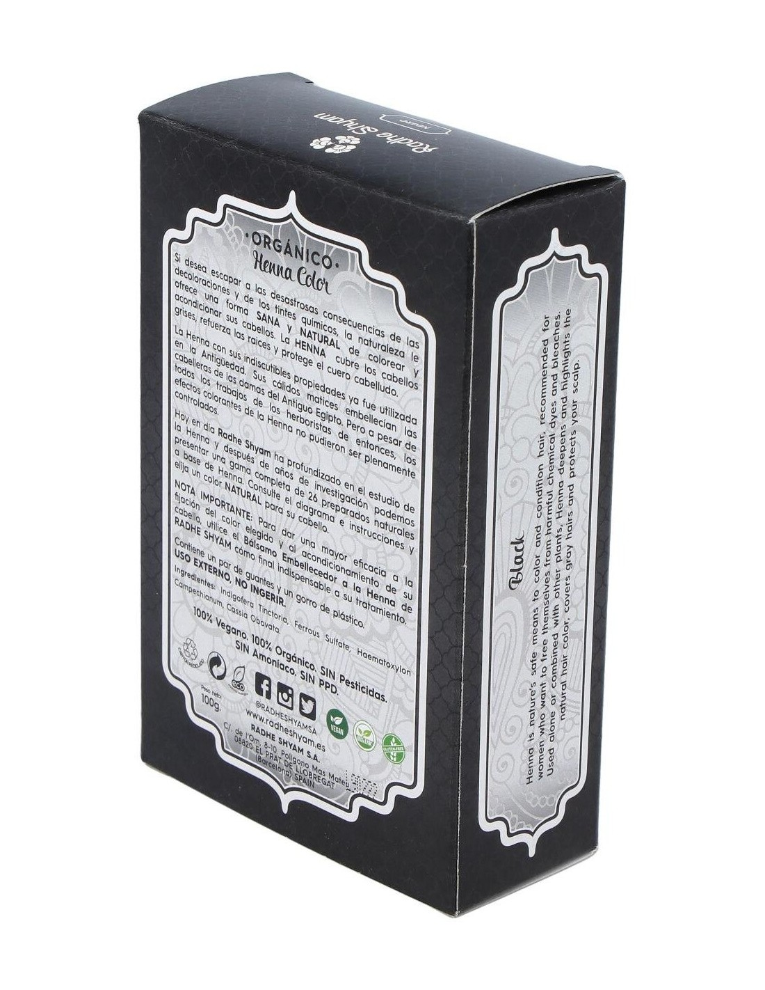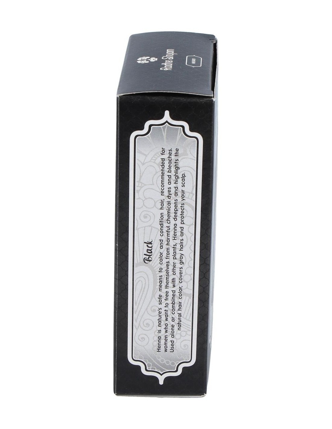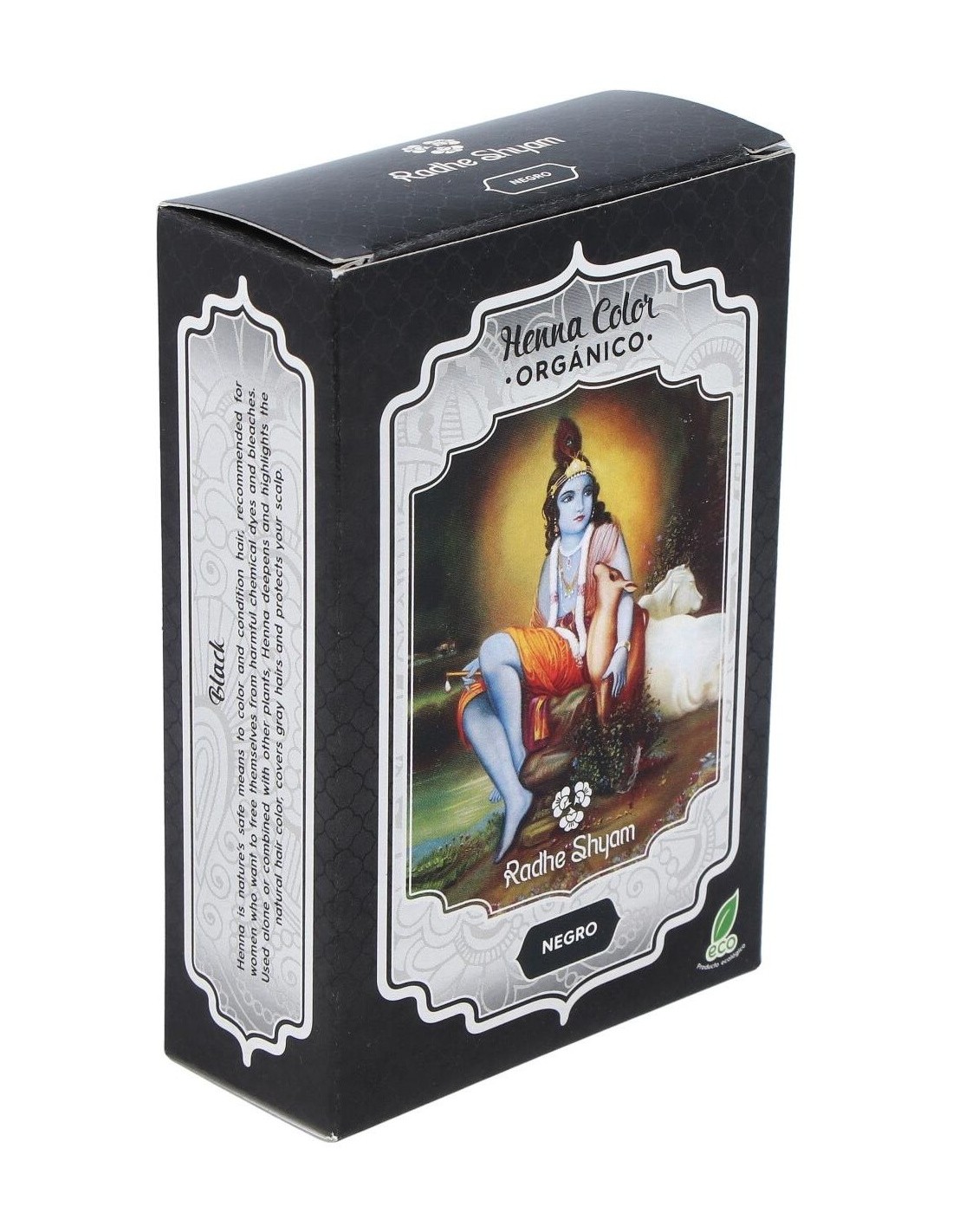 Radhe Shyam Henna color negro es un exclusivo tinte natural, sin químicos en su composición, que ofrece todas las propiedades de la naturaleza para colorear tu cabello. Cubre las raíces grises, refuerza la fibra y protege el cuero cabelludo.