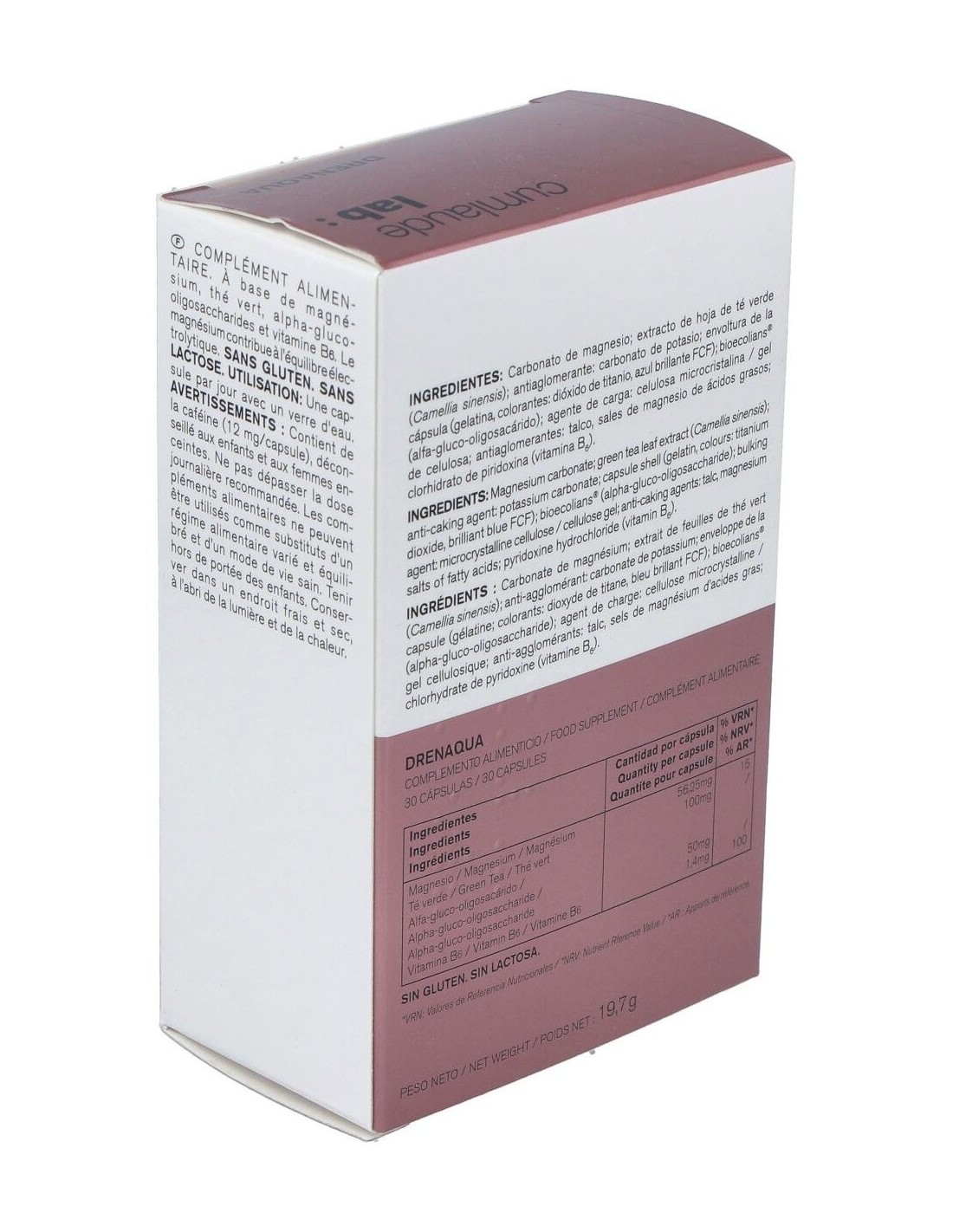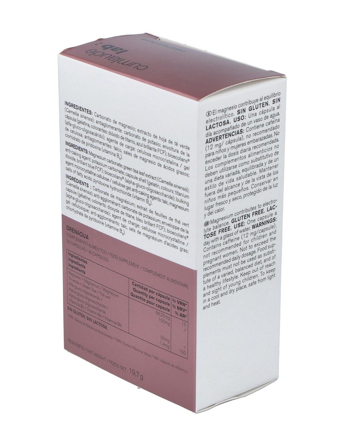 Carbonato de magnesio: Cloruro potásico: Te verde: Lactobacillus acidófilus: Celulosa microcristalina: Inulina: Talco: Magnesio estearato. Envoltura de la cápsula: Gelatina: Colorantes E-171, E-133.