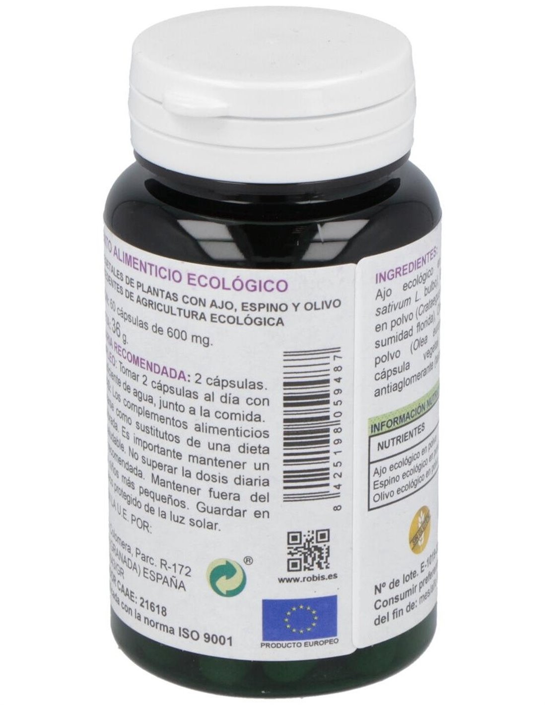 ROBISEl Ajo-Espino-Olivo 60Cap. Eco de Robis es un suplemento natural para adultos que busca apoyar el bienestar cardiovascular mediante una fórmula combinada de ajo, espino y olivo.