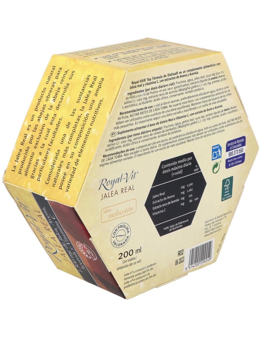 ROYAL-VIT®Dietisa jalea real royalvit top fórmula es un complemento alimenticio que combate el cansancio y la fatiga. Gracias a su formulación contribuye al metabolismo energético normal.