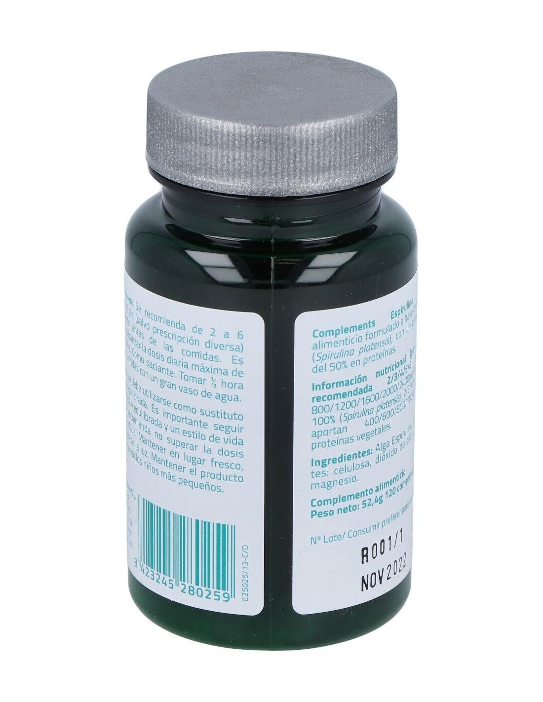 - Contiene 120 comprimidos de espirulina, facilitando una dosificación práctica y constante.
