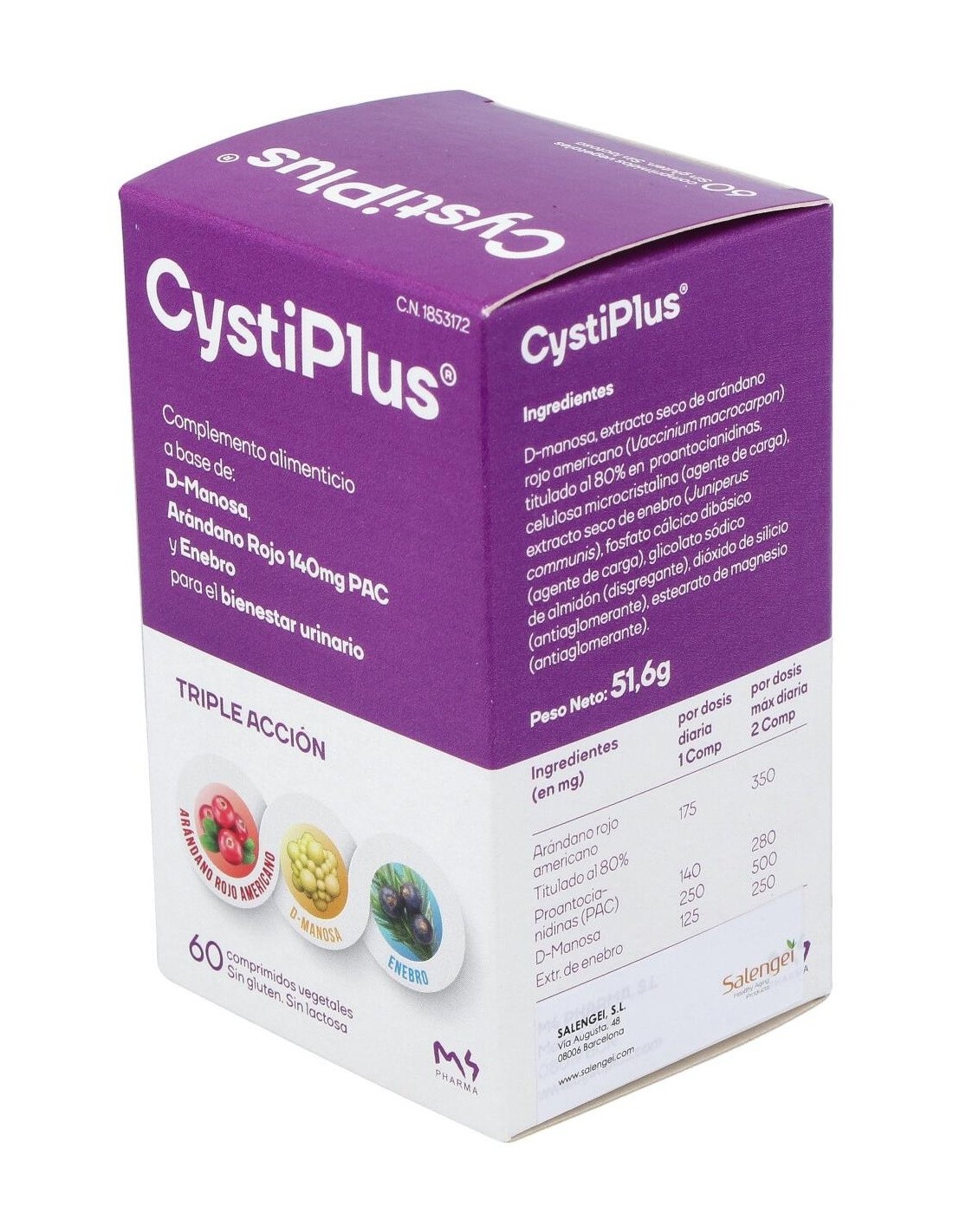 Cystiplus de Salengei es un complemento alimenticio a base de arándano rojo 140 mg PAC (proantocianidinas), D-manosa, y enebro para el bienestar urinario. Gracias a sus ingredientes de origen natural Cystiplus® aporta la máxima prevención gracias a su fórmula de triple acción, con una concentración eficiente que actúa de forma sinérgica para prevenir e inhibir la adhesión de las bacterias a las mucosas y células uroteliales.Indicaciones:
