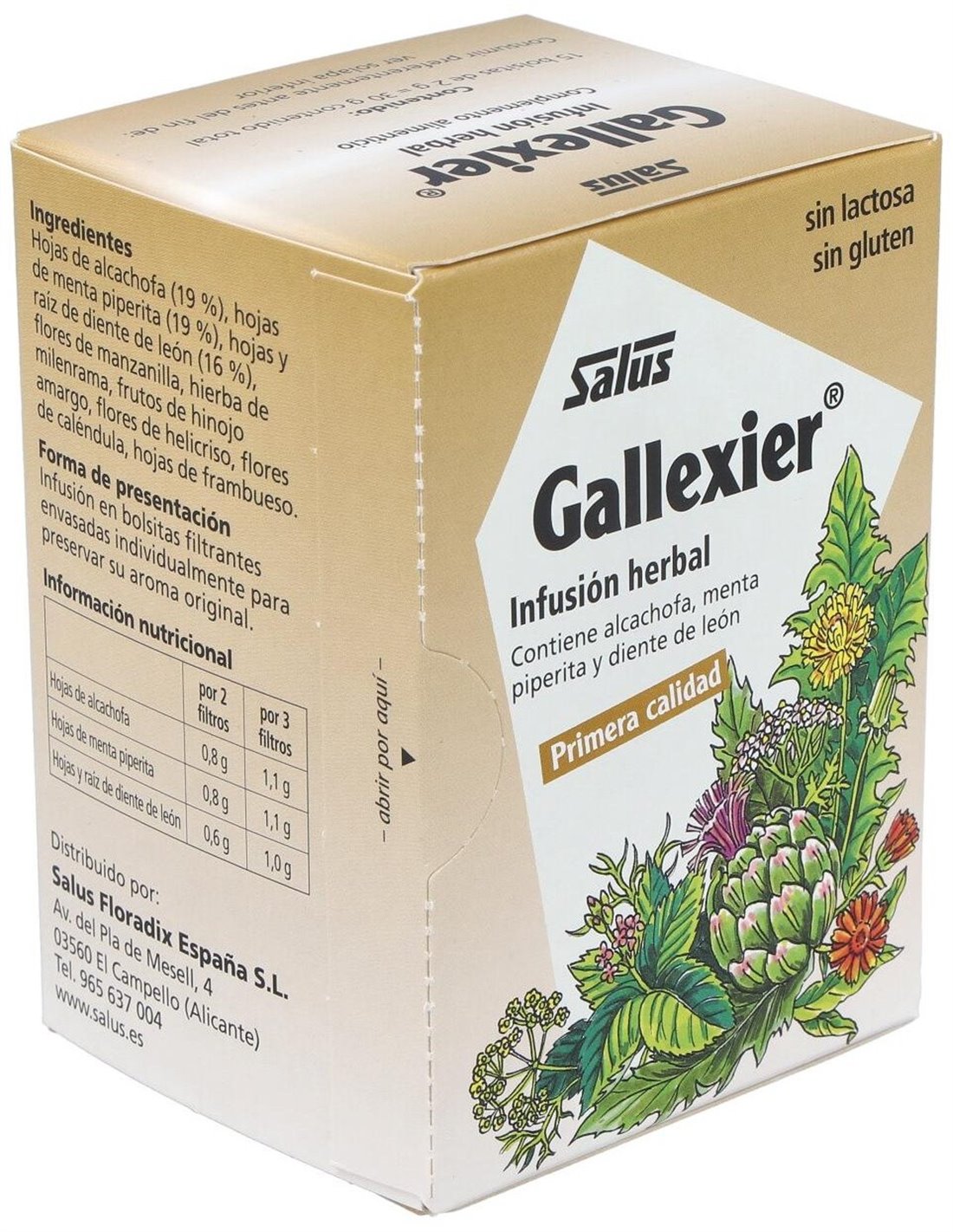 Ingredientes:Hojas de alcachofa (19 %), hojas de menta piperita (19 %), hojas y raíz de diente de león (16 %), flores de manzanilla, hierba de milenrama, frutos de hinojo amargo, flores de helicriso, flores de caléndula, hojas de frambueso.Modo de empleo:Verter agua hirviendo (aprox. 125 ml) sobre la bolsita. Dejar en reposo tapado durante 5 a 10 minutos y después retirar la bolsita. Tomar de 2 a 3 tazas al día de infusión caliente durante las comidas. Presentación:Envase de 15 filtros.