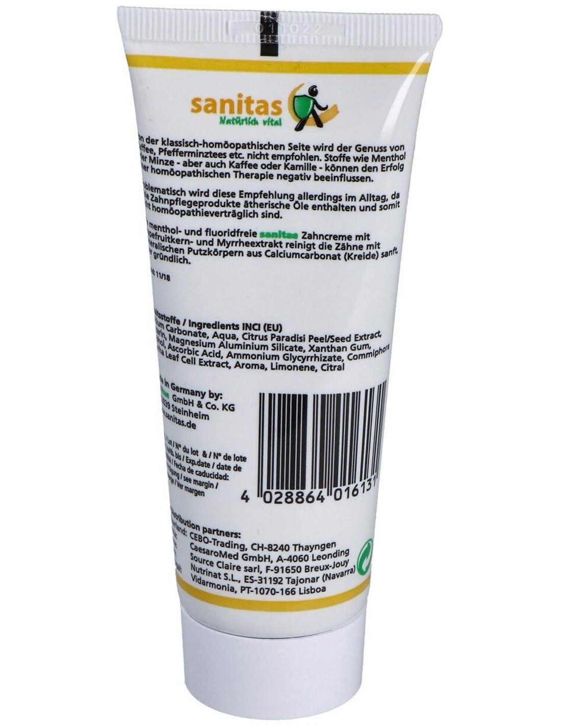 SANITASDentífrico para la higiene bucal y el cuidado de las encías con extracto de semilla de pomelo (Citrus paradisi) y extracto de mirra (Commiphora myrrha), de agradable sabor y libre de parabenos. Dentífrico compatible con la homeopatía.
