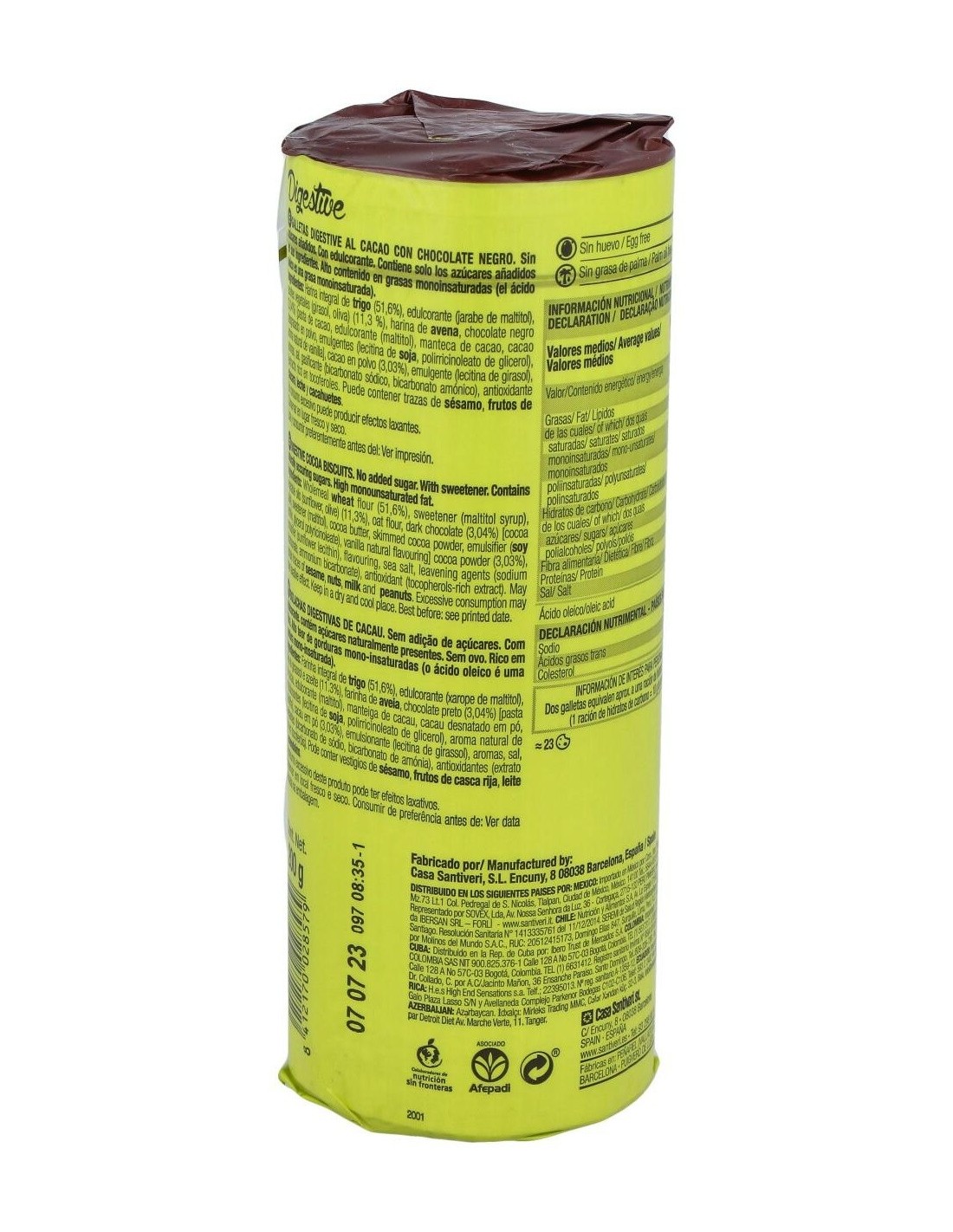Harina integral de trigo (47.1%), edulcorante (maltitol, acesulfamo), grasa vegetal no hidrogenada (12.5%), cacao en polvo (5.5%), harina de avena, sal, emulgente (lecitina de soja), aromas, gasificantes (bicarbonato sódico, bicarbonato amónico), colorante (caramelo), antioxidante (extractos ricos en tocoferoles vitamina E-), ácido fólico.