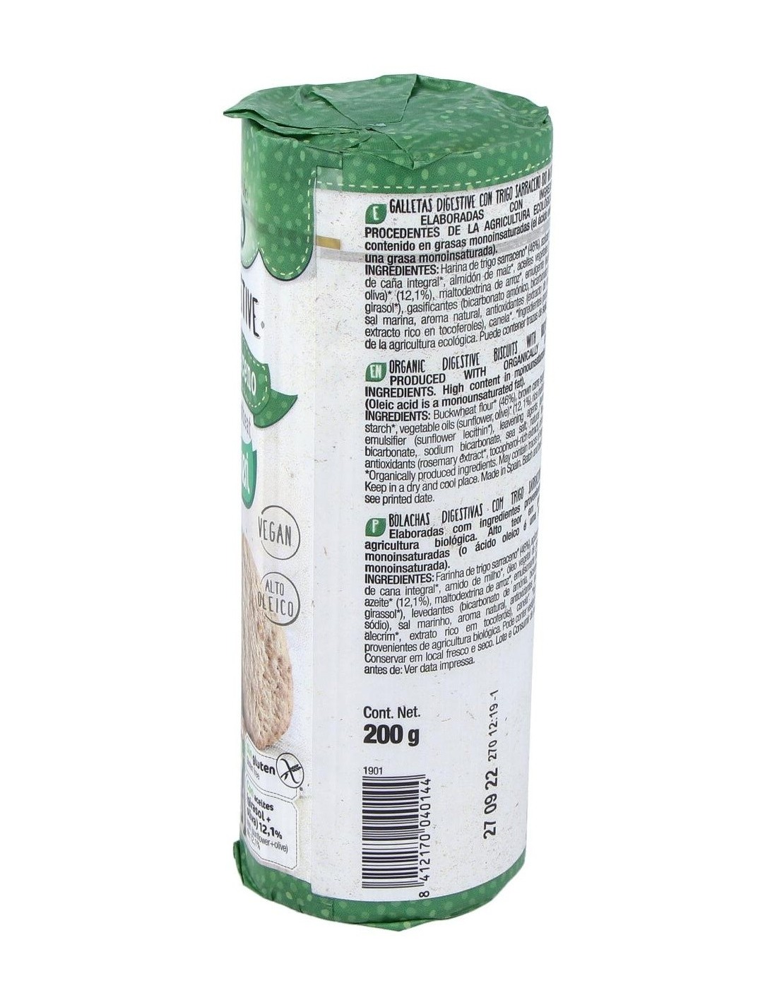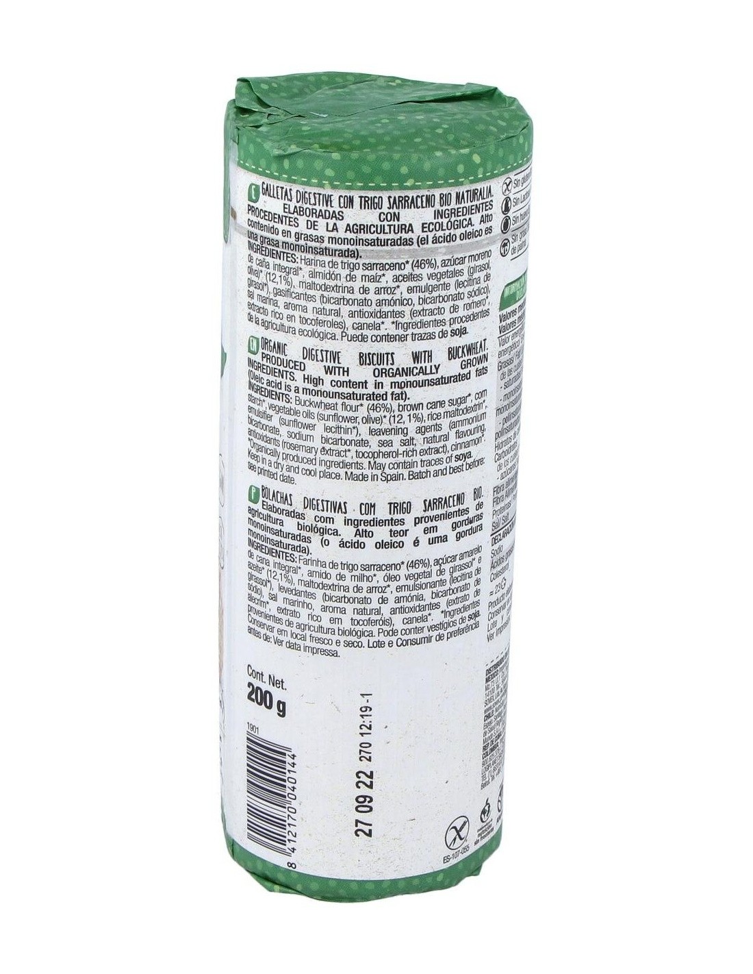 Harina de trigo sarraceno* (46%), azúcar moreno de caña integral*, almidón de maíz*, aceites vegetales (girasol, oliva)* (12,1%), maltodextrina de arroz*, emulgente (lecitina de girasol), gasificantes (bicarbonato amónico, bicarbonato sódico), sal marina, aroma natural, antioxidantes (extracto de romero*, extracto rico en tocoferoles), canela*.
