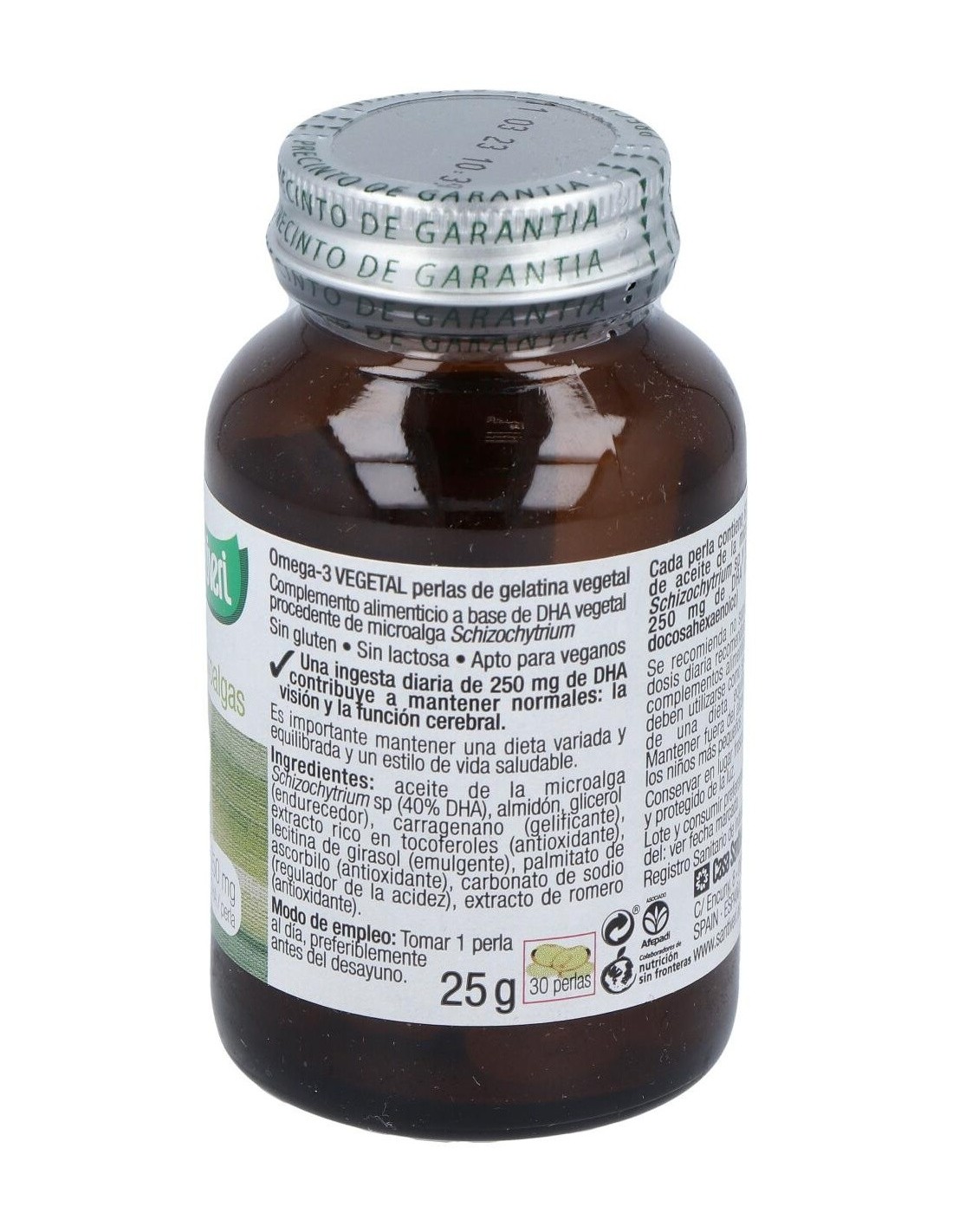 625 mg de aceite de la microalga Schizochytrium sp y aporta 250 mg de DHA (ácido docosahexaenoico)
