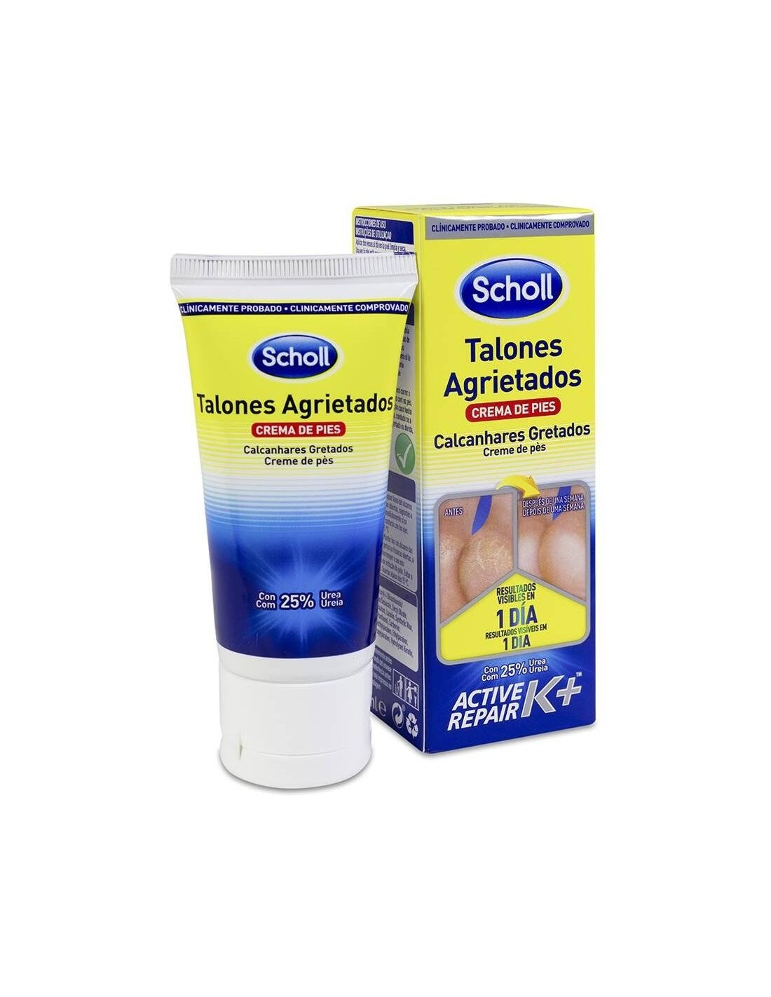 SCHOLLRepara los talones para unos resultados visibles en 1 día. Contiene 25% Urea y Keratina Active Repair K+, un ingrediente clínicamente probado para ayudar al proceso natural de recuperación del cuerpo ayudando a construir un soporte natural e impulsar la reparación de la piel. Se absorbe rápidamente. Sin sensación pegajosa y sin fragancia.