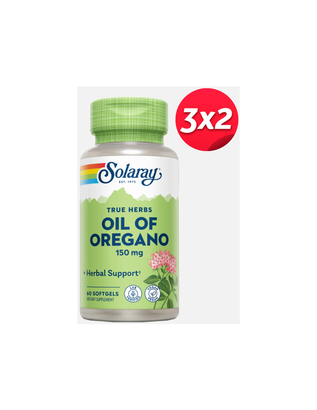 SOLARAY PACK 3X2Descubre el **SOLARAY PACK 3X2 Oil Oregan 150Mg**, un complemento natural que ofrece 60 perlas por envase, ideales para fortalecer tu bienestar diario. Cada perla contiene aceite de orégano de alta calidad, reconocido por sus propiedades antioxidantes y su apoyo al sistema inmunológico. Este pack 3x2 te brinda una excelente oportunidad para cuidar tu salud de forma práctica y económica. Perfecto para quienes buscan un producto confiable y efectivo, fácil de incorporar en su rutina diaria. ¡Aprovecha esta oferta y siente la diferencia con Solaray!