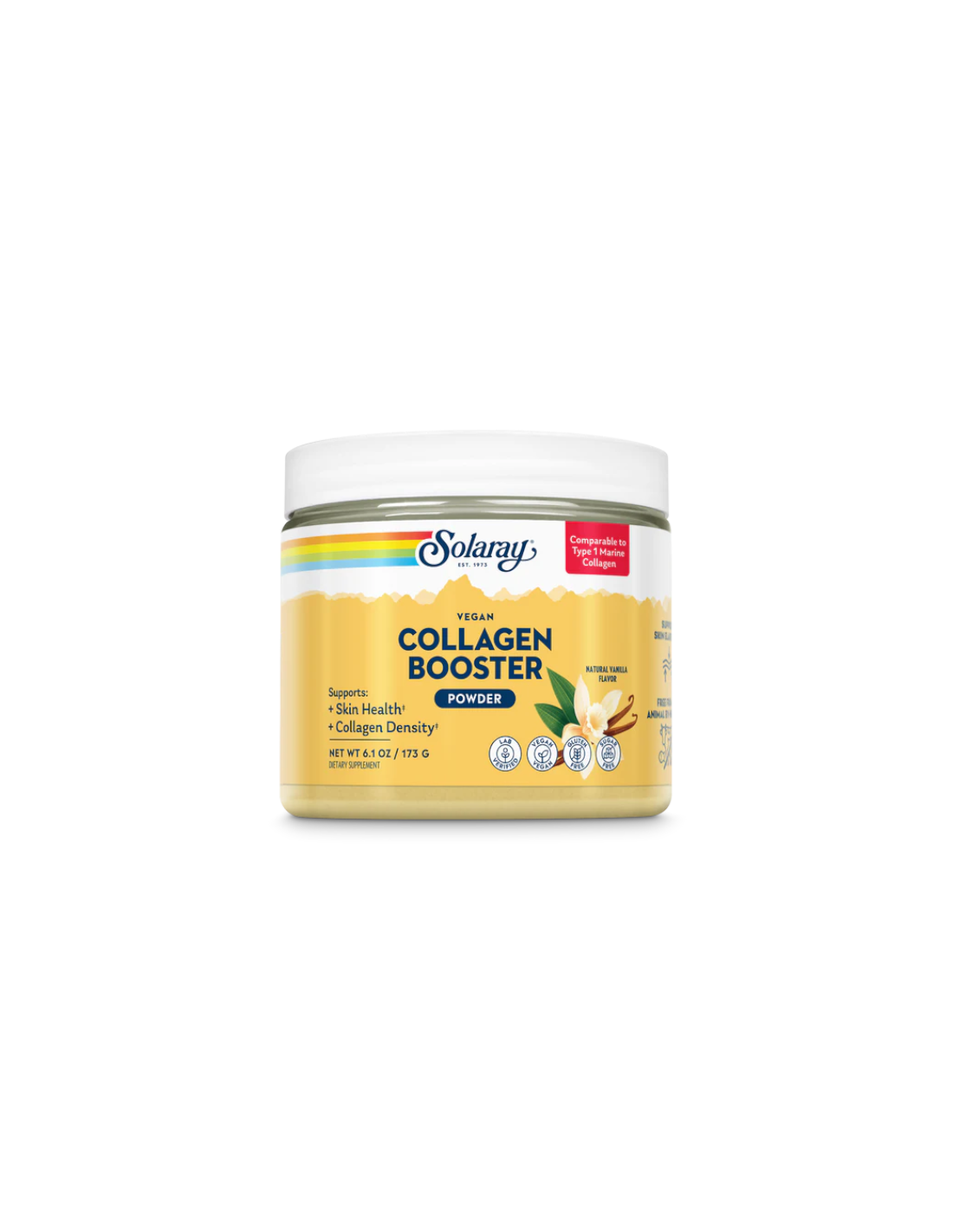 Descubre el increíble poder de Vegan Collagen Booster - 173 Gr. Vainilla de Solaray, un suplemento diseñado especialmente para quienes buscan cuidar su piel, cabello y uñas de manera natural y efectiva. Este producto es una fórmula avanzada que ayuda a estimular la producción de colágeno en el cuerpo, pero sin ingredientes de origen animal, ideal para veganos y personas conscientes de su salud.