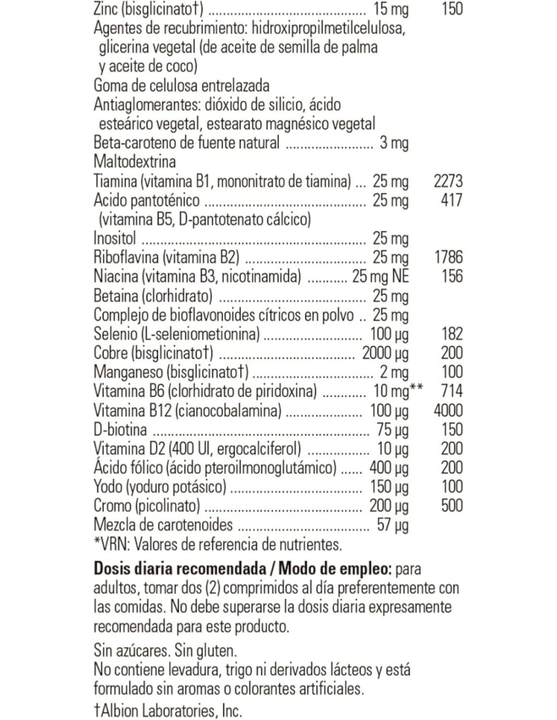 - Contiene una combinación específica de vitaminas y minerales que contribuyen al mantenimiento de funciones corporales esenciales en adultos mayores.