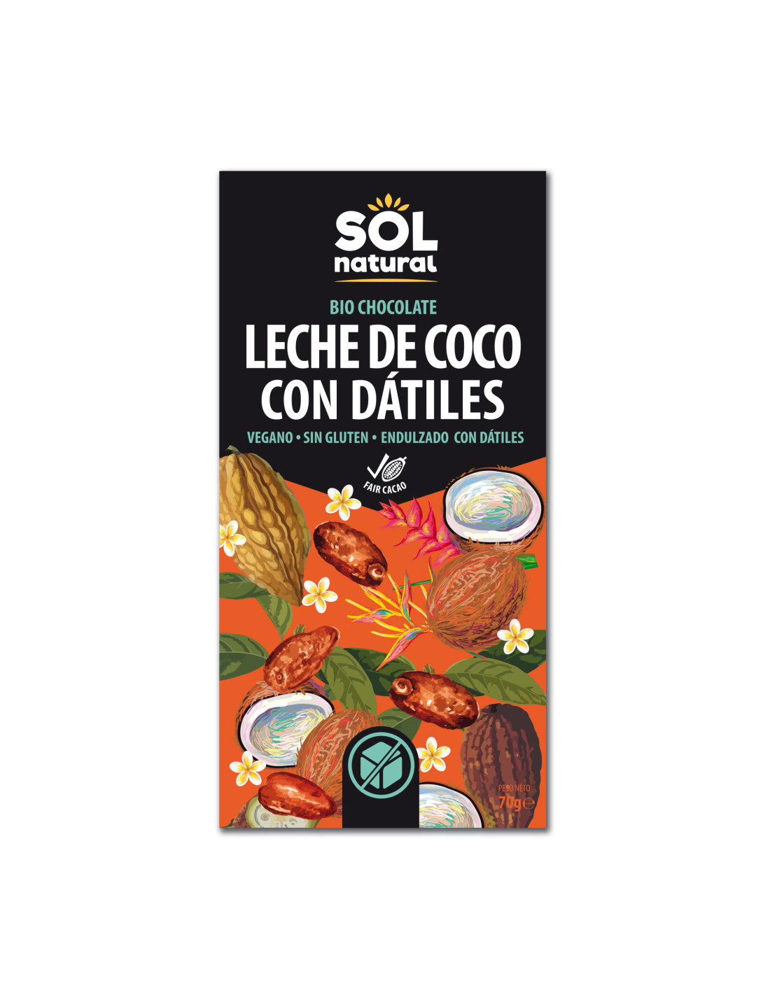 SOLNATURALCaracterísticas y Beneficios del Pack 10 Uds. Tableta Chocolate Con Leche De Coco Y Dátiles Bio 70 g de Solnatural