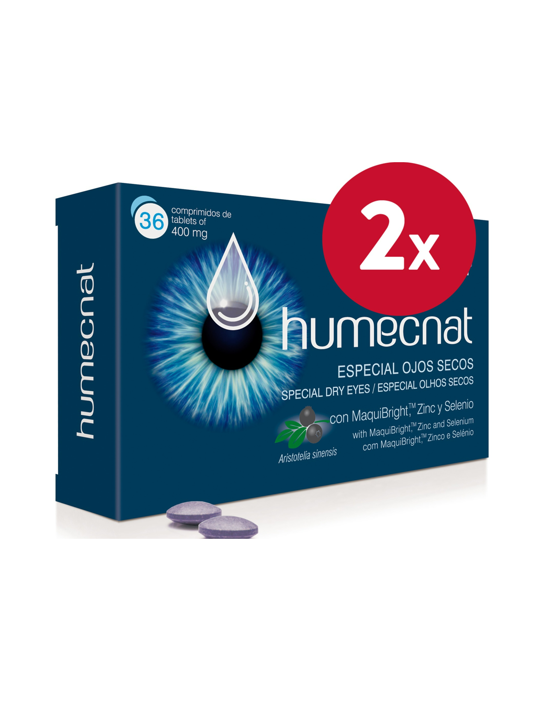 Humecnat es un complemento alimenticio destinado a mejorar la calidad de la lágrima y los síntomas asociados al ojo seco gracias a que en su formación se incluyen extracto de bayas de maqui, una baya en la que predominan los compuestos antioxidantes. Además, se añade selenio y zinc, minerales necesario para el correcto mantenimiento de la visión.