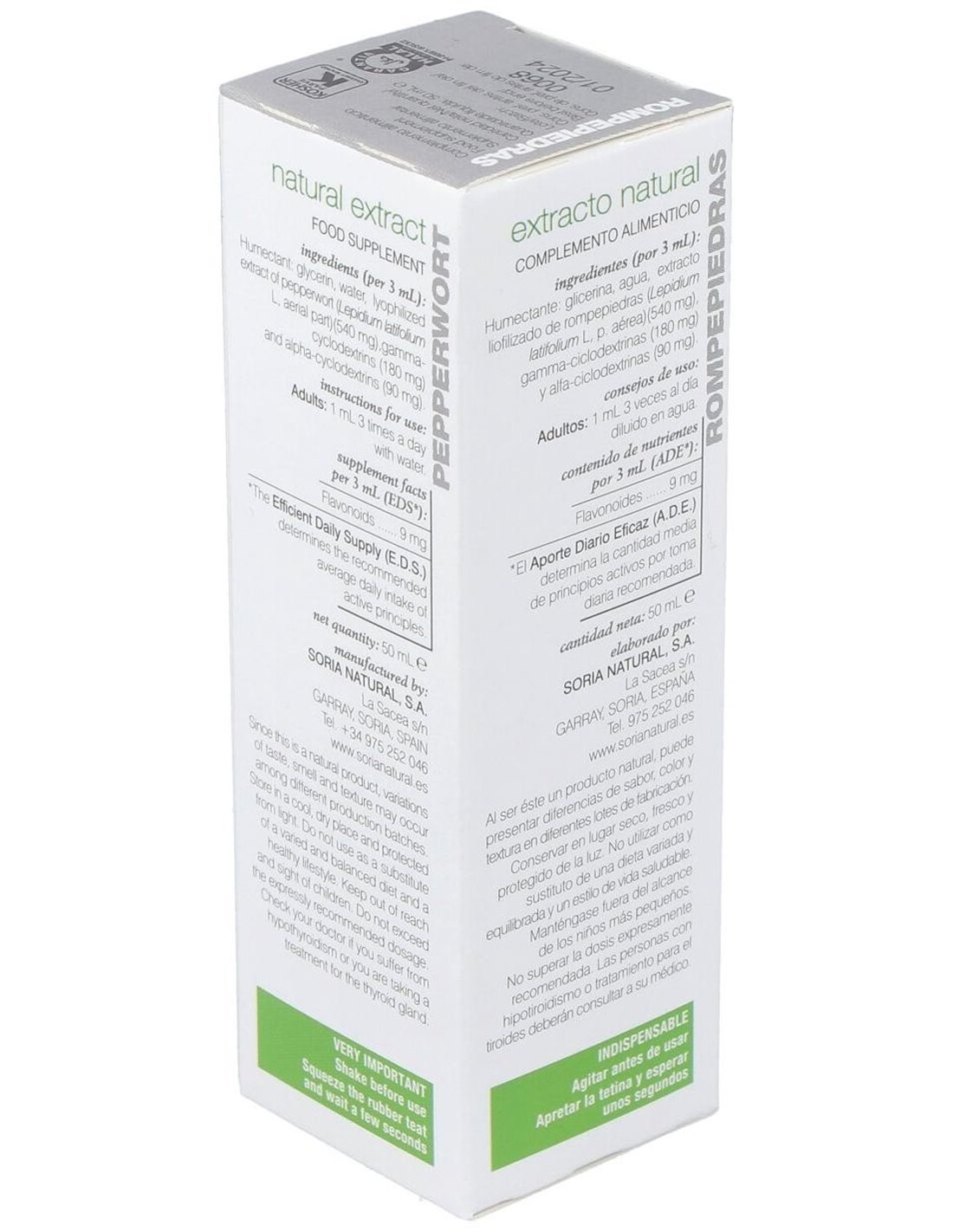 SORIA NATURALEste extracto de rompepiedras tiene como propiedades el ser diurético (hace orinar), disuelve los cálculos renales, sobre todo de oxalato cácico, y es