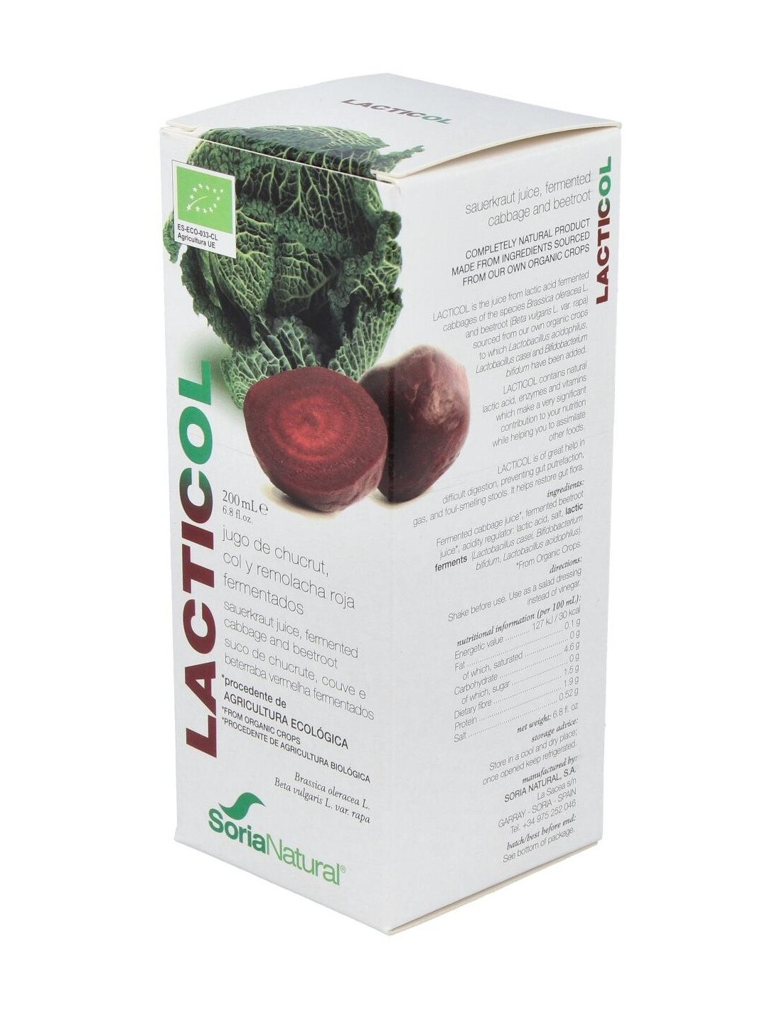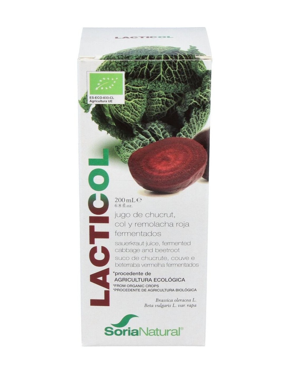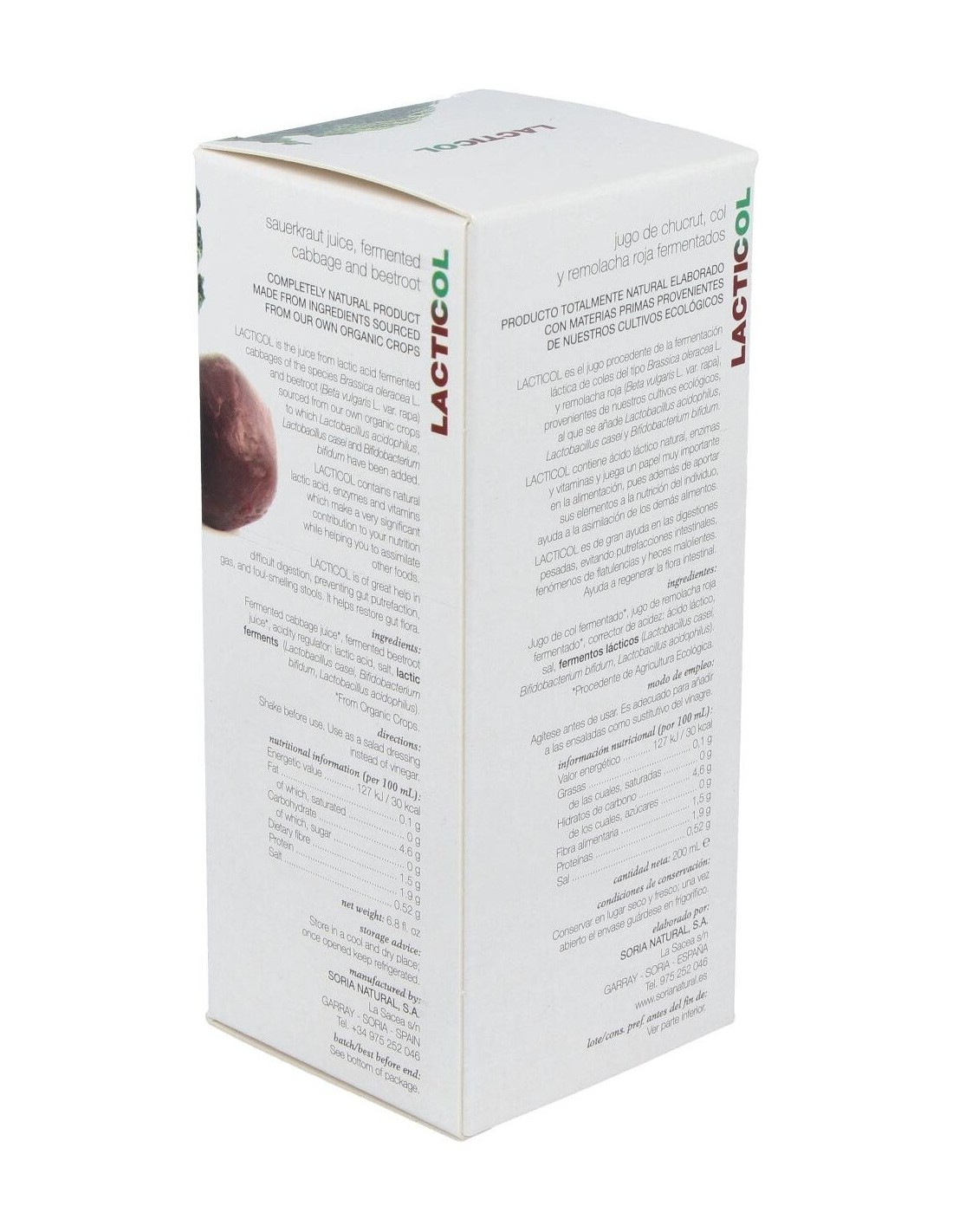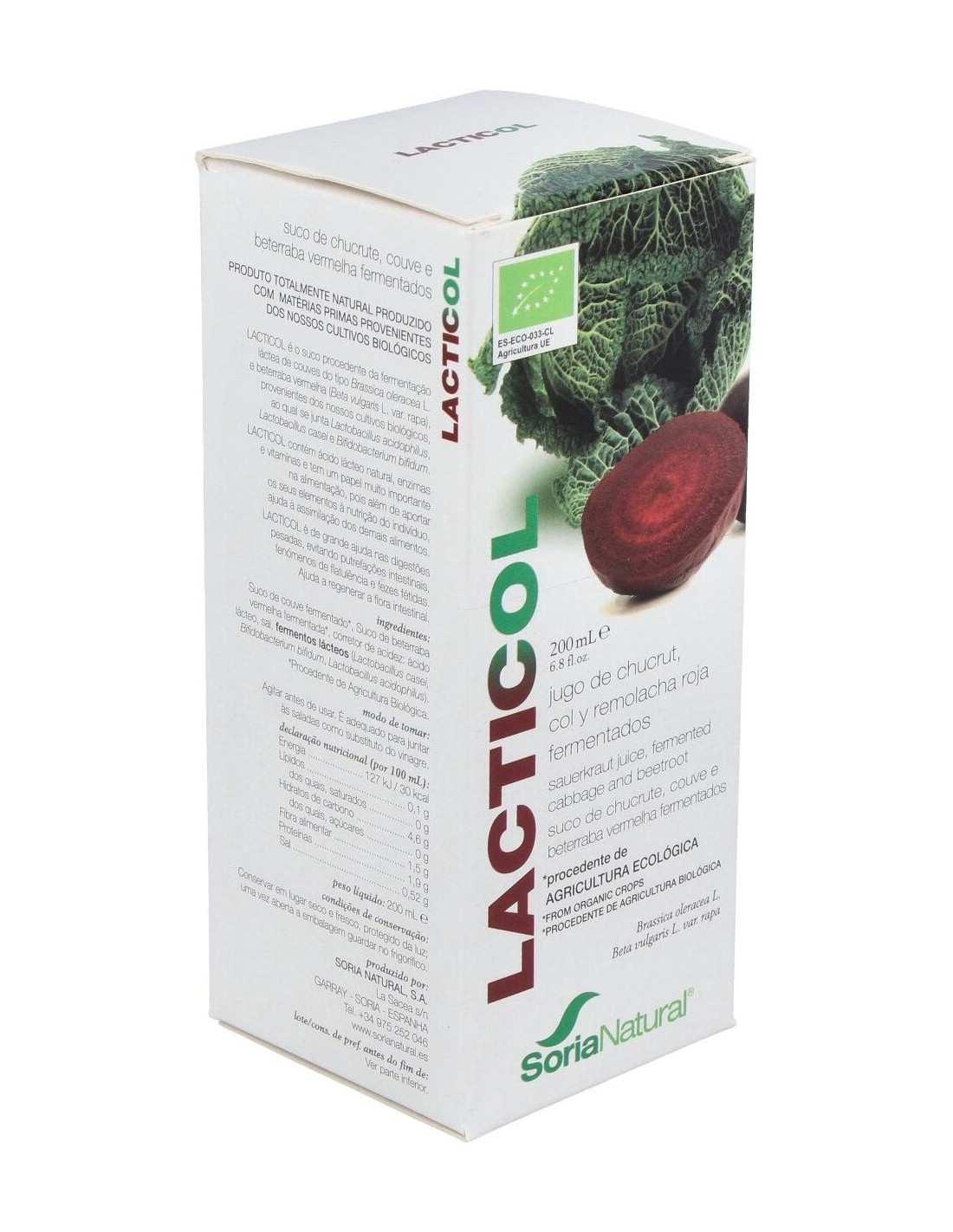 SORIA NATURALLacticol es un jugo obtenido de la fermentación natural de coles y remolacha roja procedentes de cultivos ecológicos, y enriquecido con microorganismo
