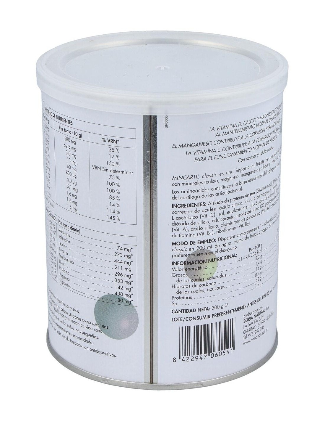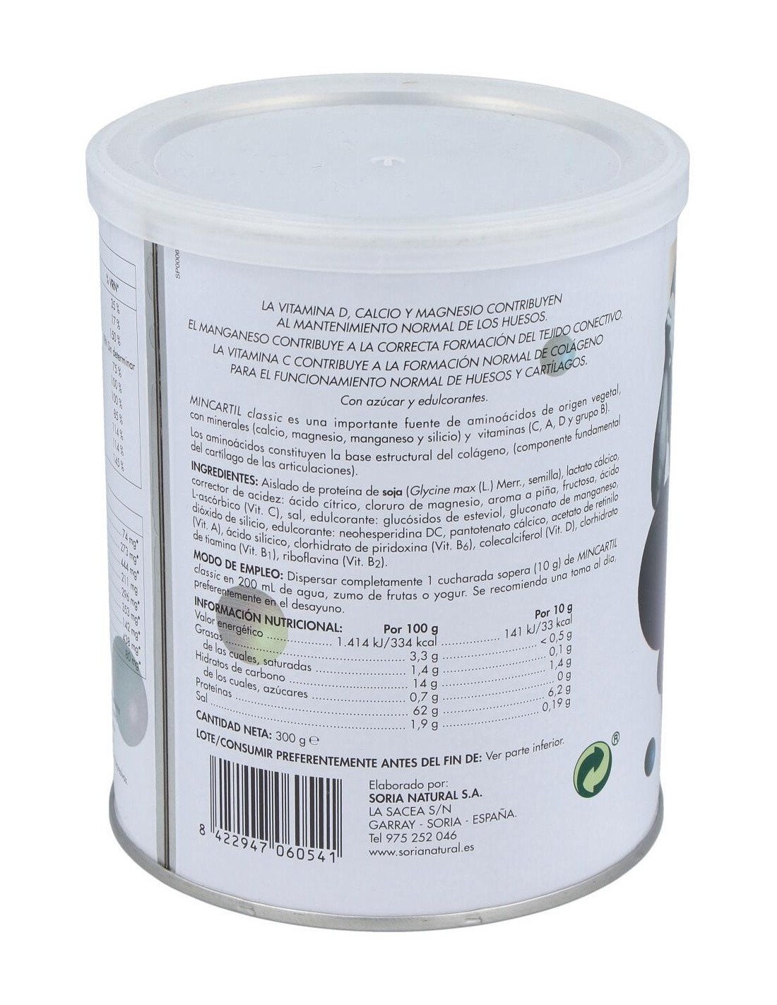 SORIA NATURALEl Mincartil Clasic 300Gr de Soria Natural es un complemento alimenticio para personas que buscan apoyar la salud articular, formulado con ingredientes naturales que contribuyen al mantenimiento del cartílago.