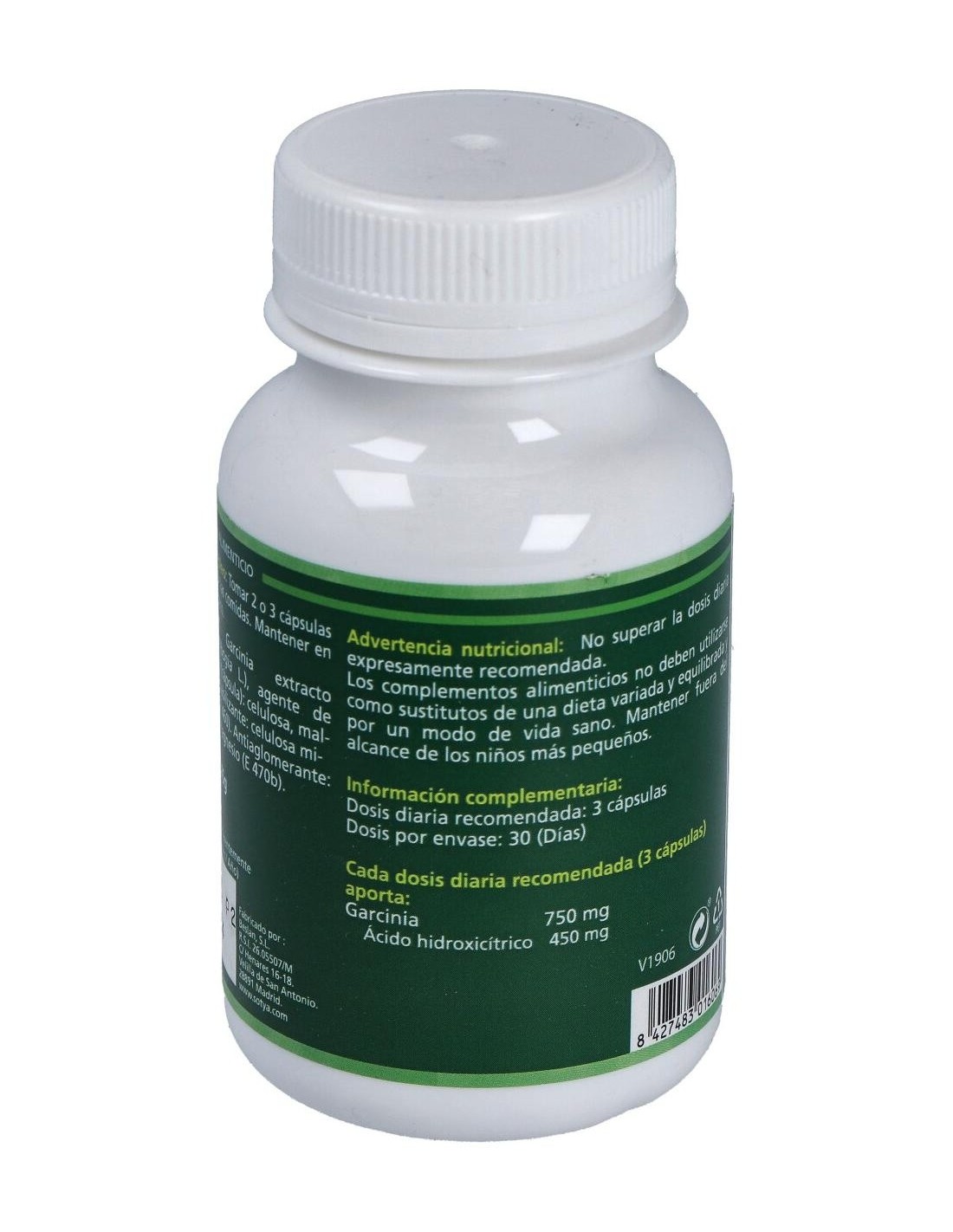 La garcinia se emplea en dietas de control de peso. Sus principios activos, lo ácidos hidroxicítricos (A.H.C.), presentes en la piel, actúan inhibiendo la enzima responsable de la conversión de los azúcares en grasas, principalmente triglicéridos y lipoproteínas malas o de baja densidad (LDL). De este modo, la garcinia ralentiza la producción de grasa, con lo que se controlan los depósitos de grasa y, manteniendo un nivel constante de azúcar en sangre, se controla también el apetito. Los A.H.C. producen sensación de saciedad y ayudan a nuestro metabolismo a quemar mejor las grasas.Para los deportistas se trata de un complemento alimenticio ideal porque ayuda a no almacenar grasas y favorece la producción de glucógeno.Ingredientes activos por cápsula:250 mg de extracto de garcinia cambogia.Modo de empleo:Tomar de 2 a 3 cápsulas al día antes de las comidas.Presentación:Bote de 90 cápsulas.
