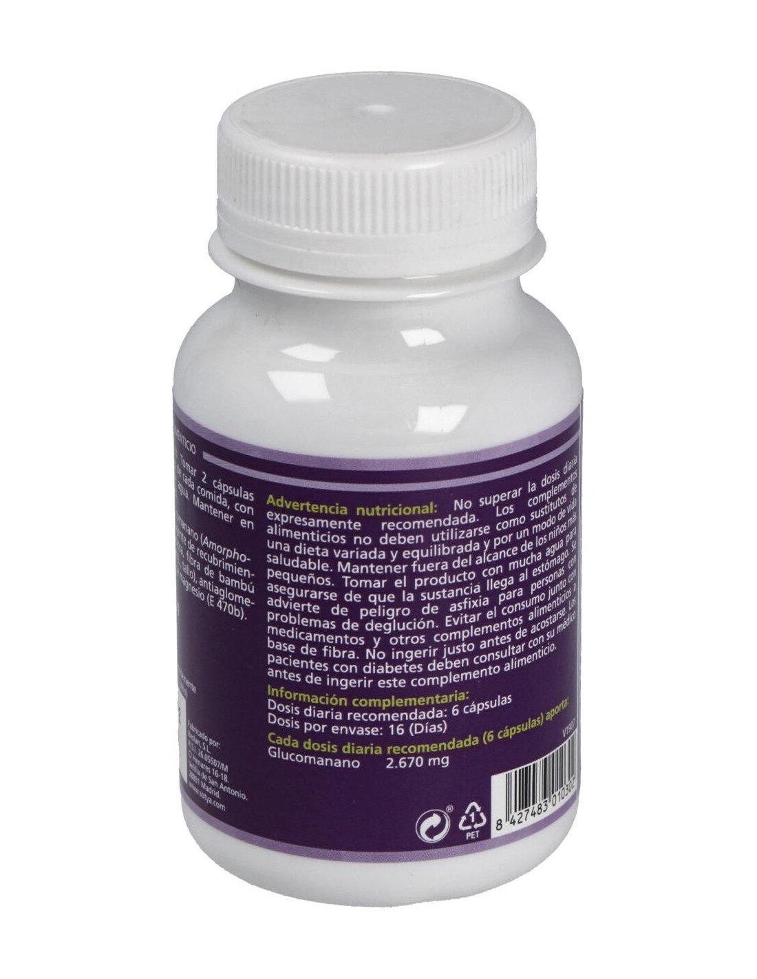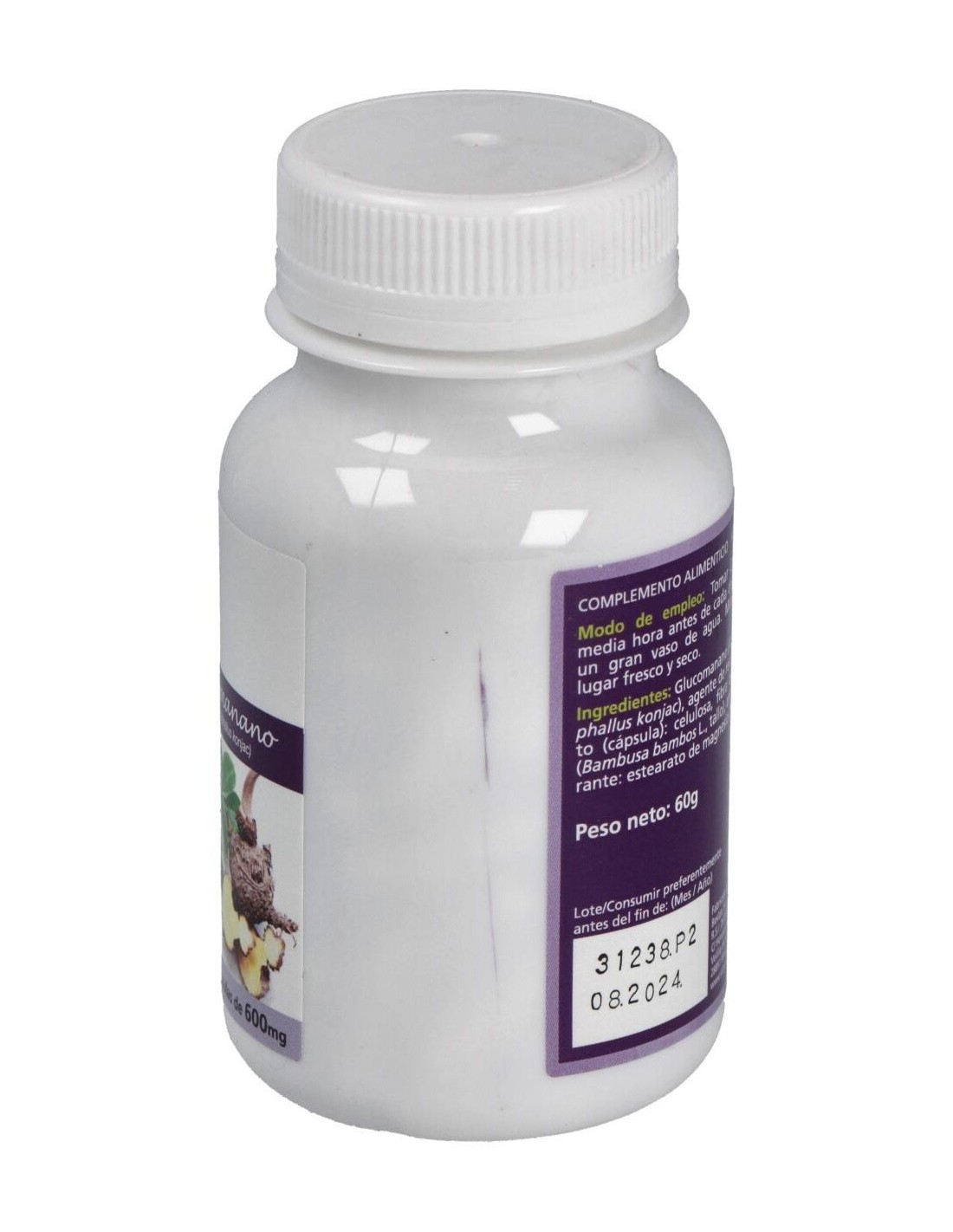 - Cada cápsula contiene 600 mg de glucomanano, una fibra derivada de la raíz de konjac que contribuye a la sensación de saciedad.