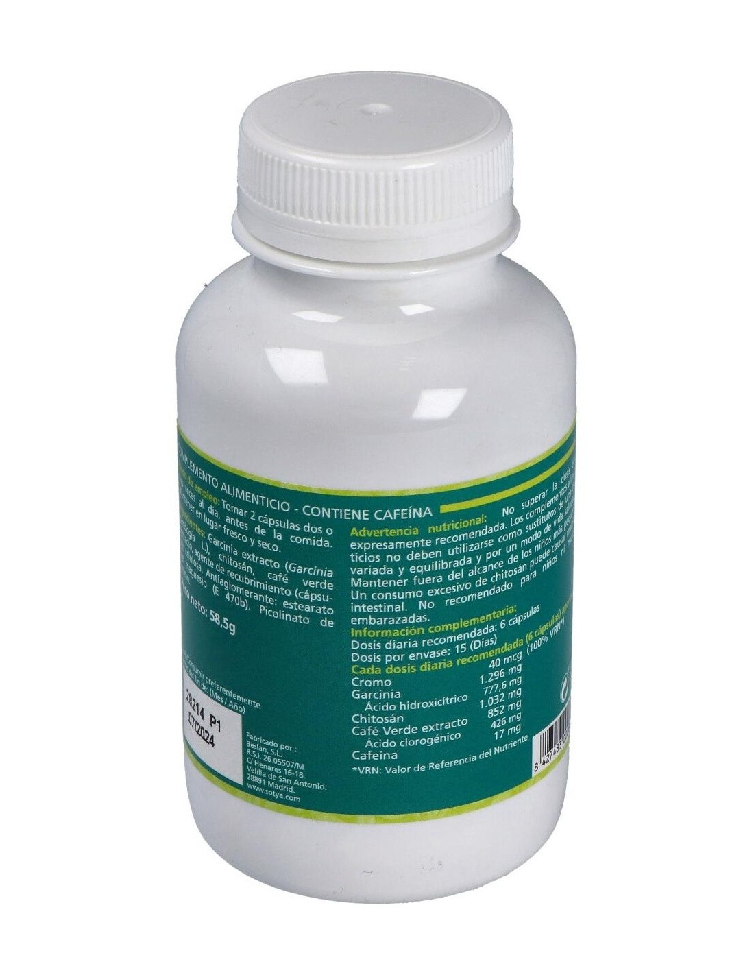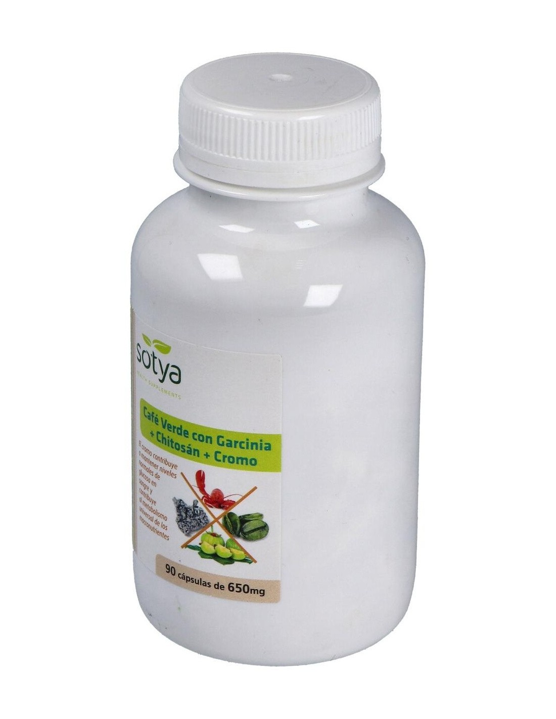SOTYAEl Café Verde Con Garcinia+Chitosán+Cromo 650Mg Cáps. 90U de Sotya es un suplemento para adultos que apoya el control del peso mediante ingredientes naturales combinados en una fórmula equilibrada.