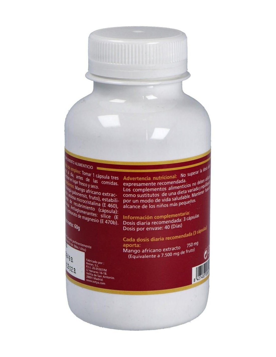 - Cada cápsula contiene 650 mg de extracto de mango africano, facilitando una ingesta controlada y constante.