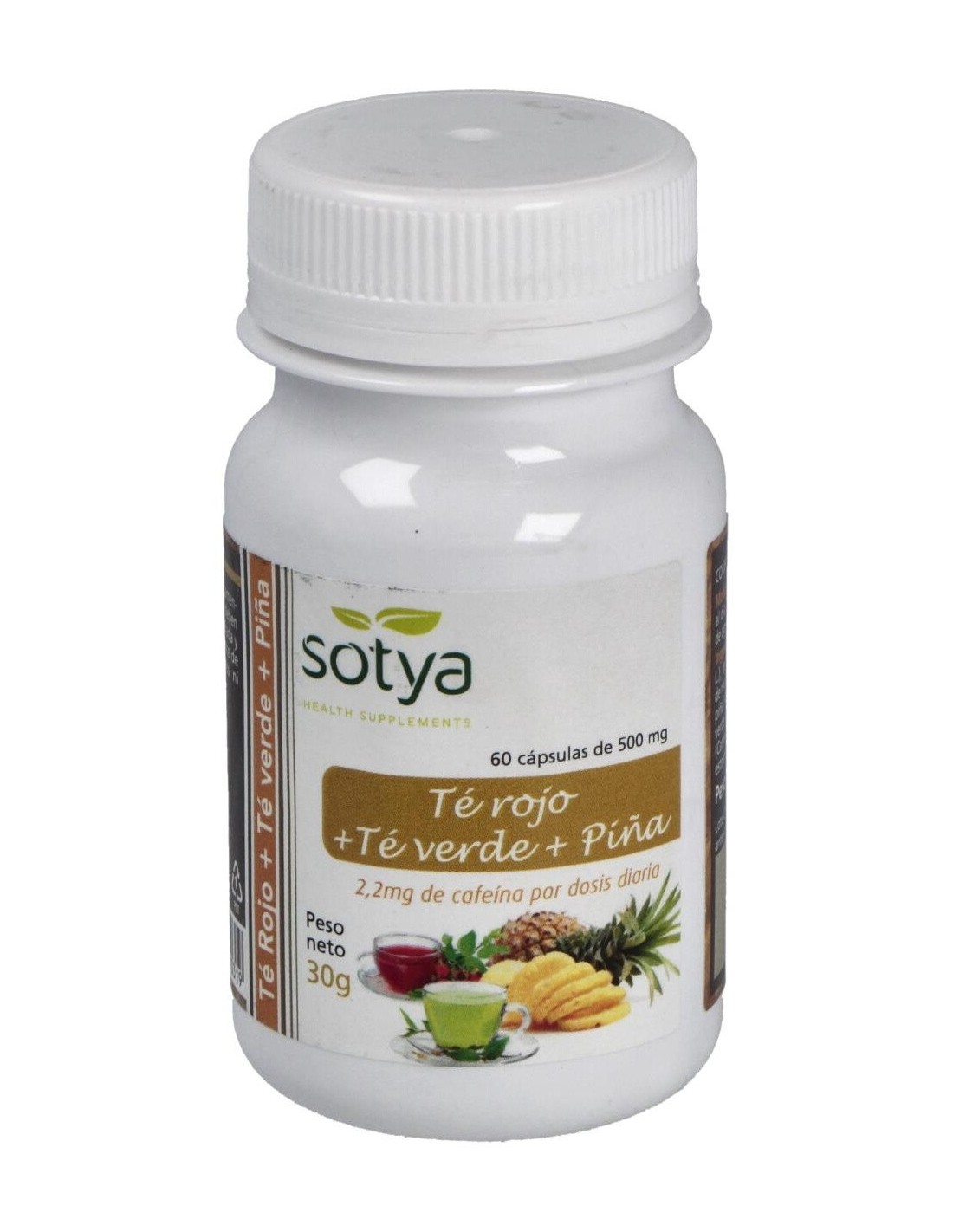 SOTYAEl Té Rojo+Té Verde+Piña 500Mg Cáps. 60U de Sotya es un suplemento natural para personas que buscan apoyar su bienestar diario, combinando extractos de té rojo, té verde y piña en una fórmula práctica y dosificada.