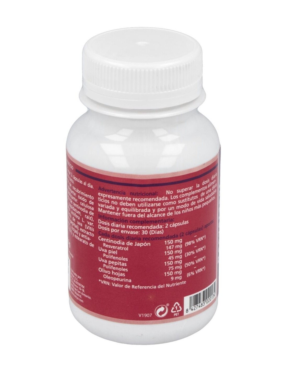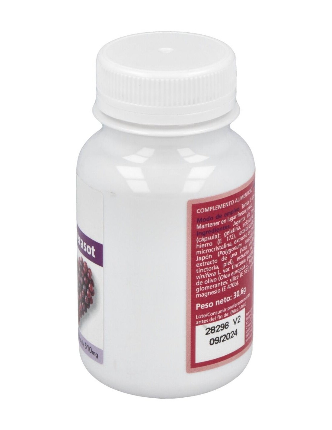 - Cada cápsula contiene 510 mg de resveratrol, un compuesto que contribuye a la protección celular frente al estrés oxidativo.