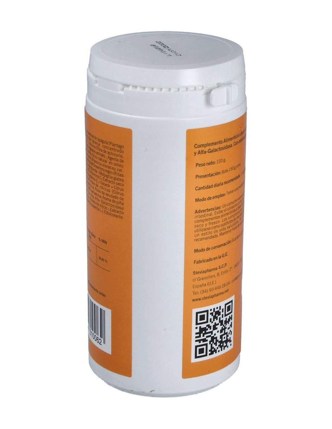 Ispágula cutícula (plantago ovata forssk): inulina (fibra de achicoria), col fermentada liofilizada, (brassica oleracea var. capitata:): grosellero negro fruto zumo concentrado: acerola fruto esn 50% vit. c (malpighia glabra l.): aloe acibar polvo hojas 18% barbaloína (aloe ferax miller), menta hojas esn ratio 10:1 (mentha piperita l.): pomelo semilla esn (citrus grandis l. osbeck). alfa-galactosidasa 30.000 galu/g.: bioflavonoides cítricos 60% hesperidina (citrus sinensis): aroma cítrico natural polvo, piña, naranja polvo zumo concentrado (citrus sinensis l.) agente de carga: maltodextrina de maíz.