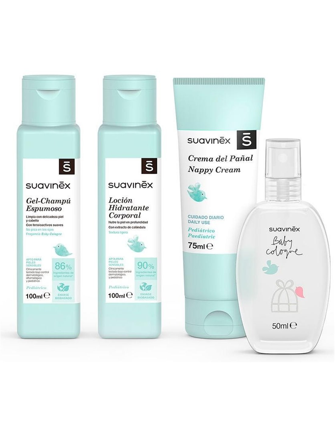 SUAVINEXNeceser de tela con todos los indispensables de cosmética pediátrica de Suavinex, en un formato ideal para los viajes y escapadas con el bebé. Contiene:\ - Baby Cologne Suavinex de 50 ml. Perfecta para llevar en el bolso. Con notas de\ rutos cítricos, flores blancas y almizcles, es baja en alcohol. No mancha la ropa.\ \ - Gel Champú Espumoso de 100ml. Para limpiar con suavidad la piel y el cabello del bebé. Con un 86% de ingredientes de origen natural, su textura y agradable fragancia Baby Cologne estimulan los sentidos del bebé y convierten el baño en una agradable experiencia. Además, no pica en los ojos.\ \ - Loción Hidratante Corporal 100 ml. Hidrata en profundidad la piel del bebe y es perfecta para los masajes después del baño. Con textura ligera y de rápida absorción, con un 90% de ingredientes de origen natural.\ \ - Crema del pañal de 75 ml. La crema del paña de Suavinex protege de irritaciones y rojeces. Con un 90% de ingredientes de origen natural, es apta para el cuidado diario de bebés con pieles normales y tendencia moderada a la irritación.