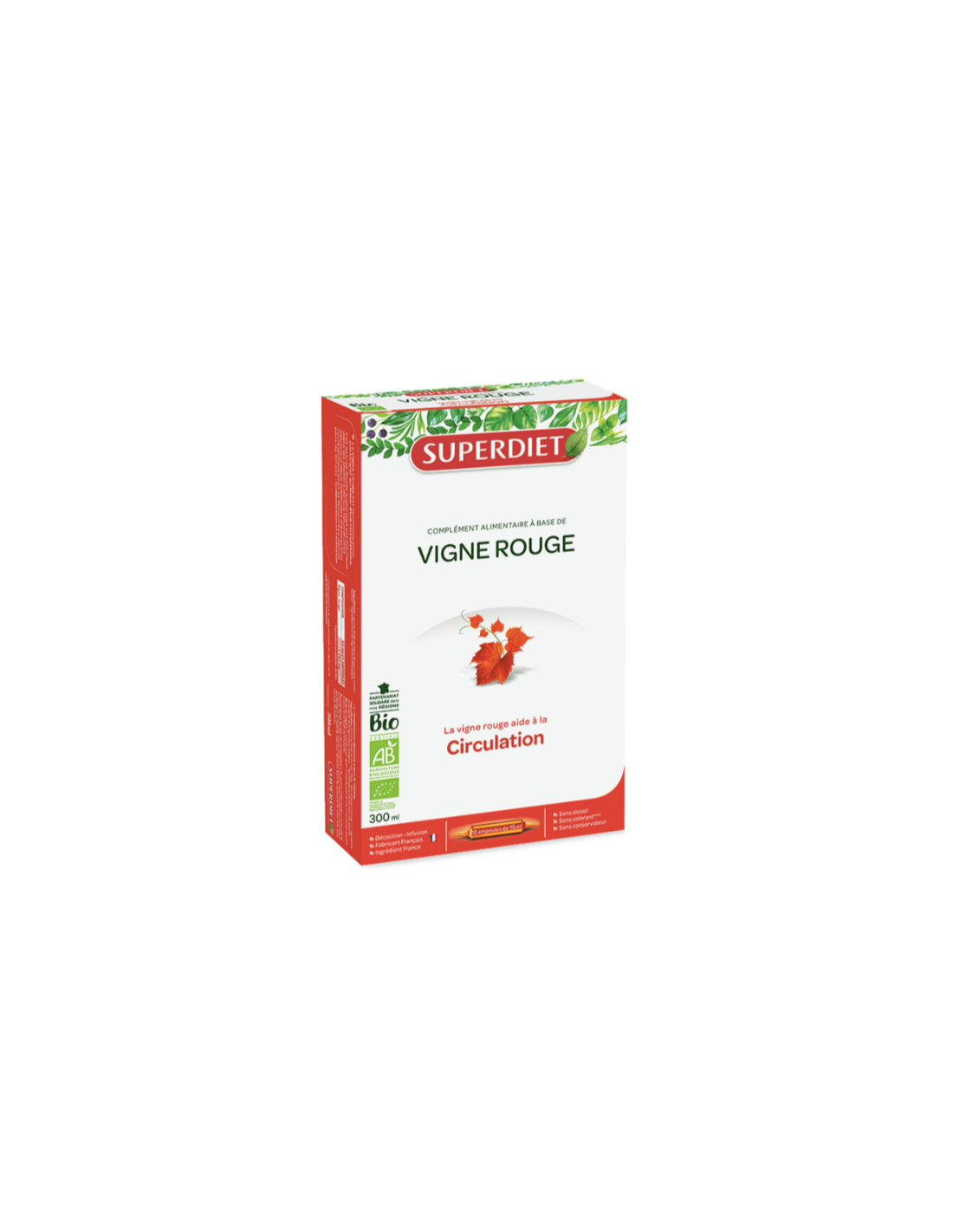 SUPERDIETVid Roja Bio 20Amp. Agbio de Superdiet es un complemento natural para personas que buscan apoyar su bienestar diario, elaborado con extracto de vid roja ecológica que contribuye a la salud vascular.