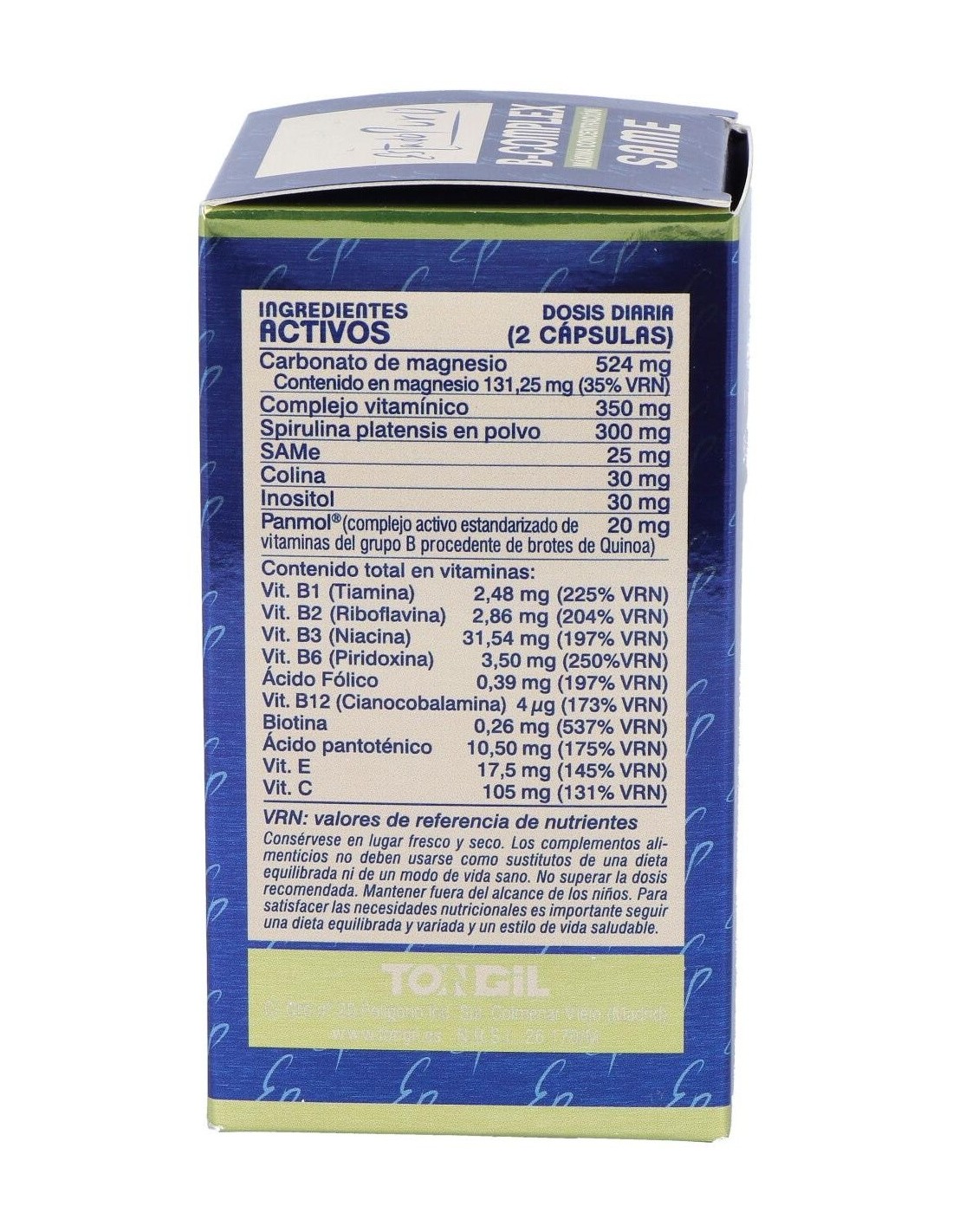 TONGILComplemento alimenticio a base de vitaminas del grupo B, Spirulina platensis, Magnesio y SAMe (S-adenosil-metionina).