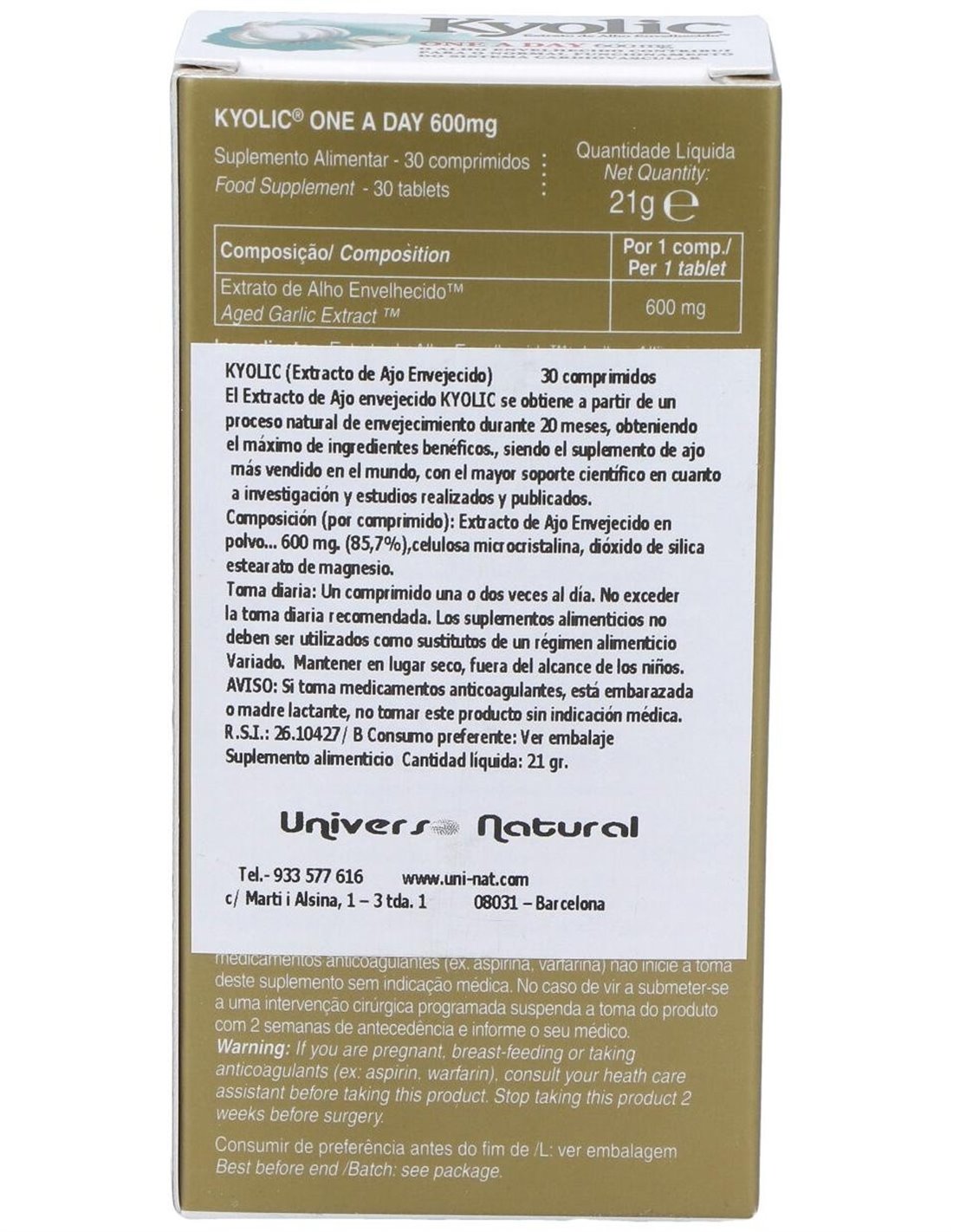 Extracto de ajo envejecido Kyolic®600mg. Otros: Celulosa microcristalina, dióxido de silicio, estearato de magnesio.
