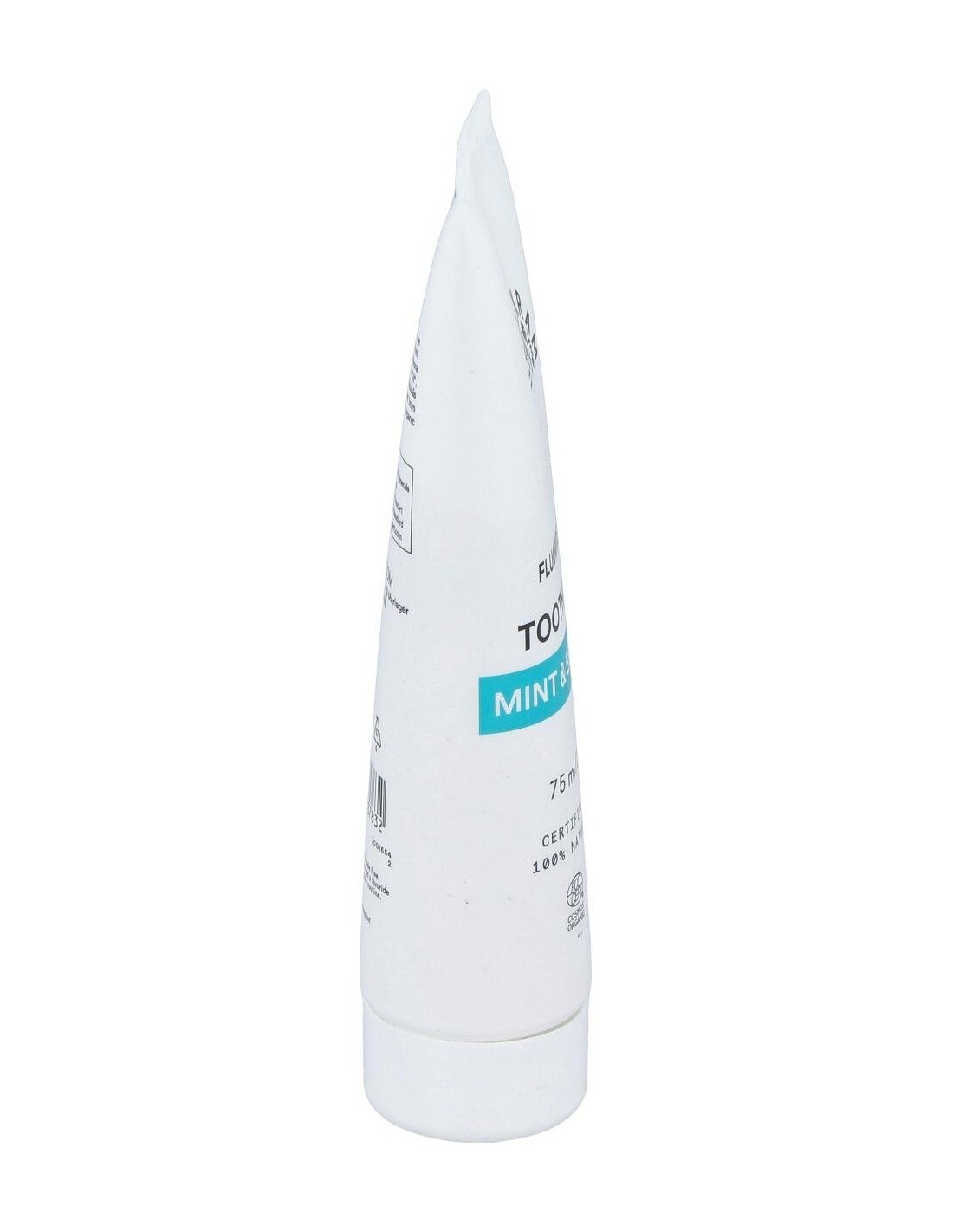 Dentífrico con menta y té verde. Sin flúor. Eficaz en los diferentes aspectos del cepillado. La creta que contiene se recupera del fondo marino y se pulveriza. Por eso la pasta tiene color natural Al sabor fresco de la menta se une el té verde. Los polifenoles del té verde tienen un efecto positivo sobre los dientes y las encías. El alto contenido de aloe vera ayuda a proteger las encías. El toque final es la mirra que tiene un efecto desinfectante. COSMOS ORGANIC certificado por Ecocert Greenlife. Vegano. No testado con animales.