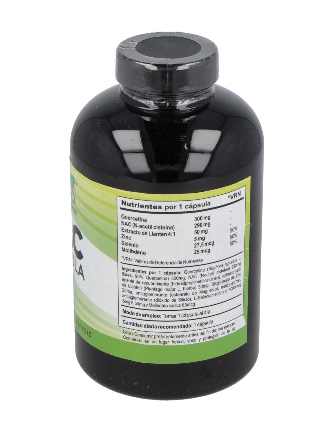 Quercetina (saphora japonica L, flores, 90% quercetina), NAC, Hidroxipropilmetilcelulosa, Extracto seco de llantén (plantago major L, hierba), Bisglicinato de zinc, Estearato de magnesio, Maltodextrina, Dióxido de silicio, L-seleniometionina, Molibdato sódico.
