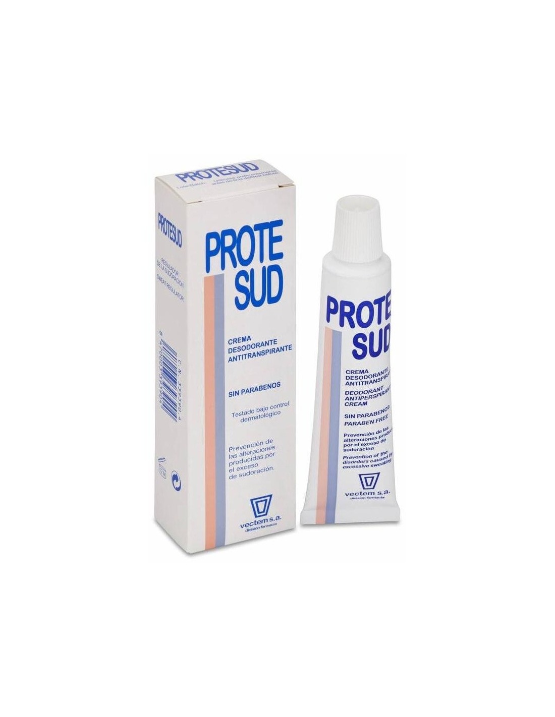 VECTEMCrema reguladora de la sudoración y desodorante para la prevención del mal olor y de las alteraciones producidas por la sudoración excesiva en pies, axilas y pliegues de la piel. Compatibilidad cutánea testada bajo control dermatológico. La crema Protesud® combina ingredientes que combaten la hiperhidrosis y la bromhidrosis actuando a tres niveles:\ Disminuyen la sudoración, reduciendo sus molestias y las alteraciones de la piel.\ Absorben la humedad local.\ Frenan la fermentación del sudor, limitando así la generación de mal olor.
