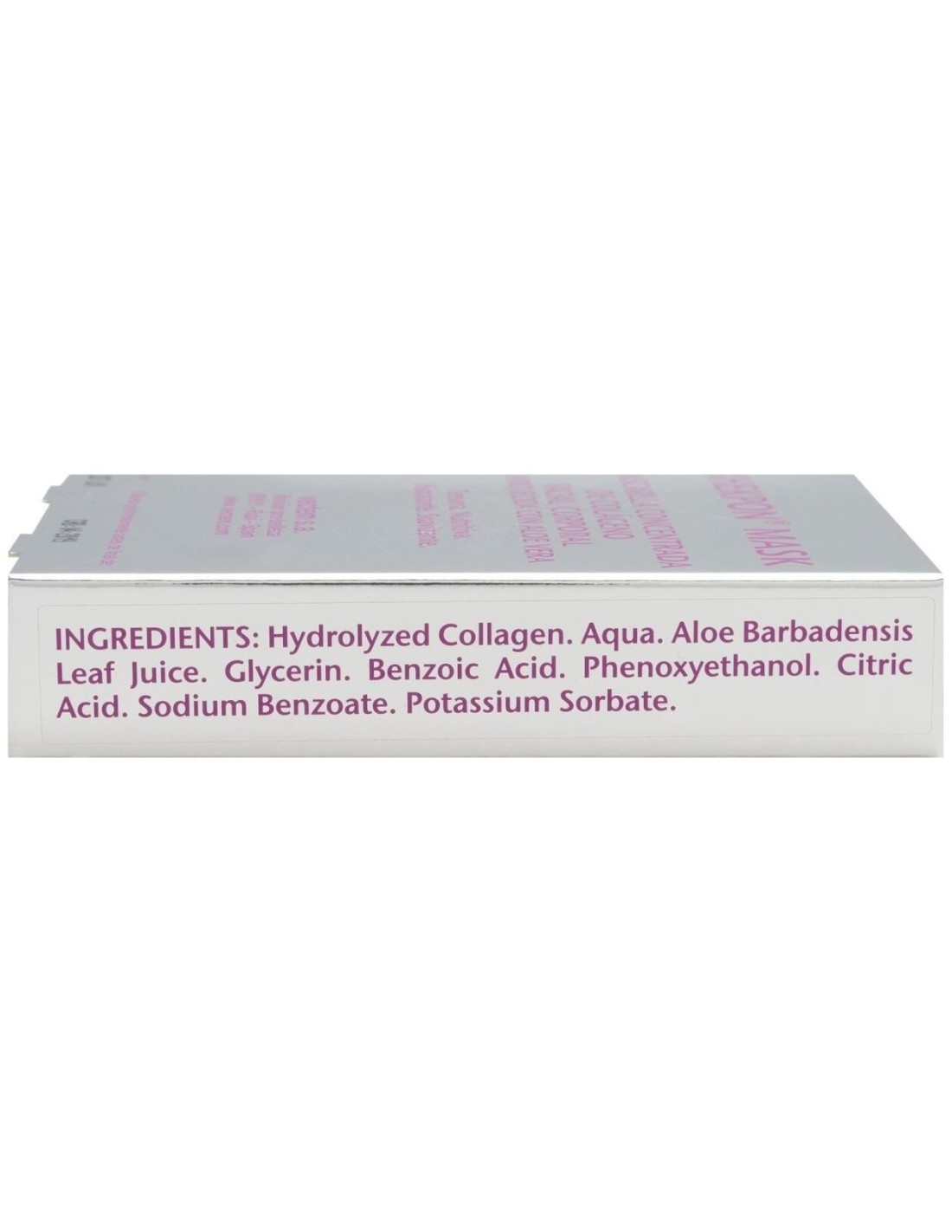 HYDROLYZED COLLAGEN. AQUA. ALOE BARBADENSIS EXTRACT. BENZOIC ACID. METHYLPARABEN. ETHYLPARABEN. SODIUM BENZOATE. POTASSIUM SORBATE.