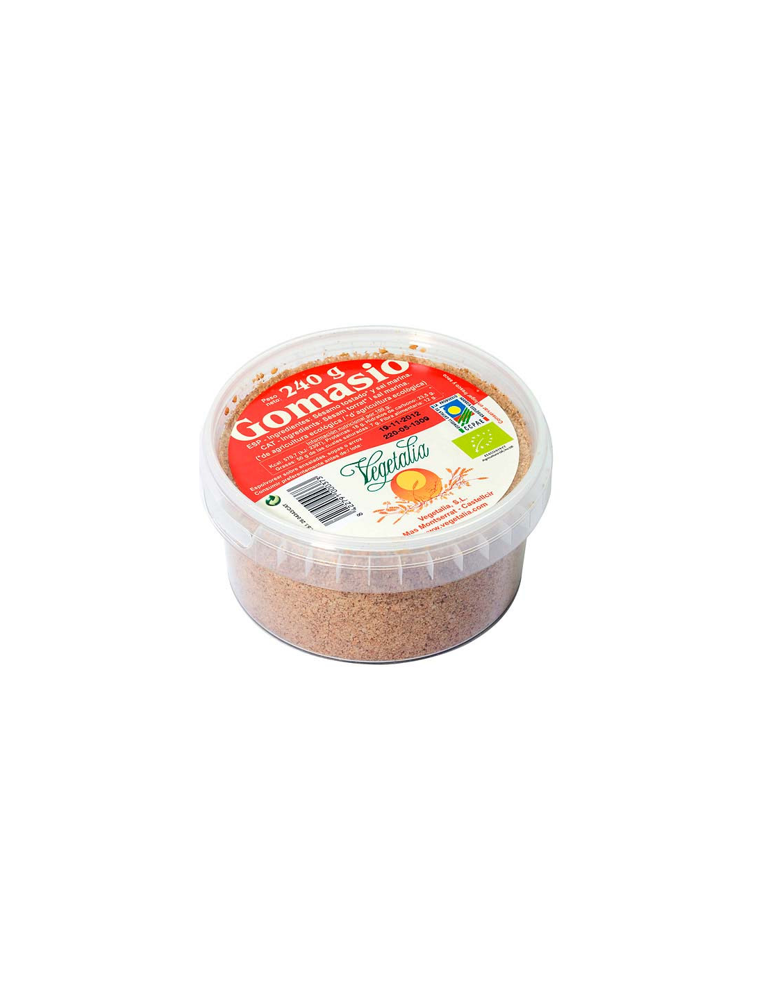 Sésamo tostado* y sal marina. Valor nutricional por 100 g: Valor energético:2397KJ/570.7Kcal Grasas:50 g - de las cuales saturadas:7 g Hidratos de carbono:23.5 g Fibras:12 g Proteínas:18 g (*)= De agricultura ecológica.