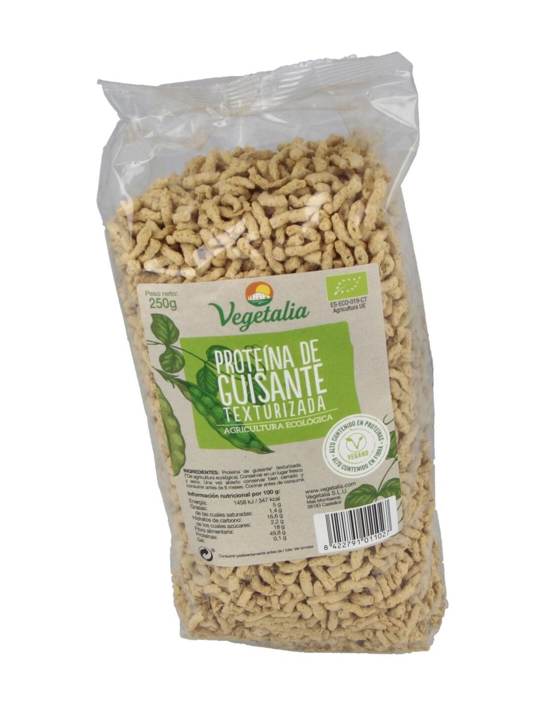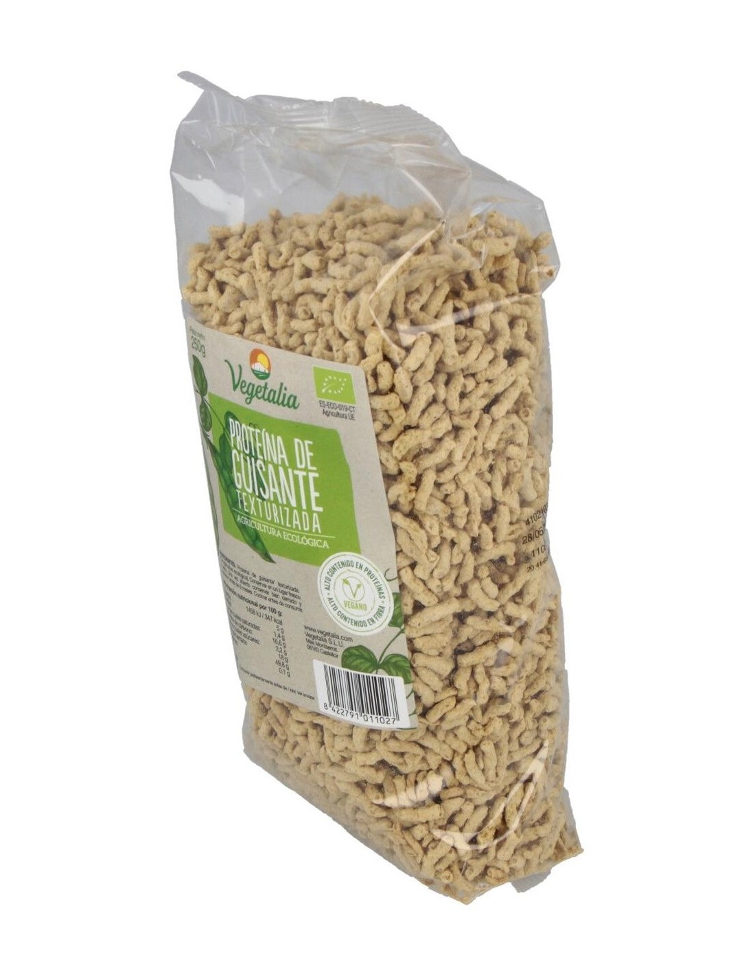 VEGETALIAProteína de guisante texturizada biológica con alto contenido en proteínas y fibras. Elaborado a partir de guisantes procedentes de agricultura ecológica, es un producto recomendado para reemplazar carnes y pescados.