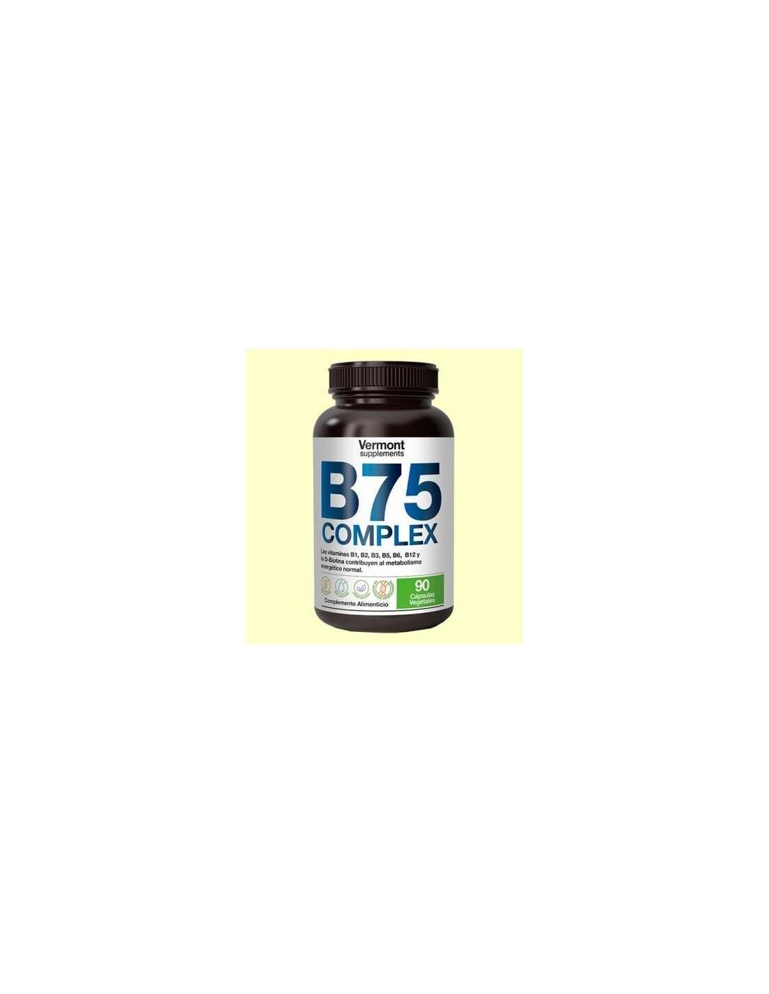 VERMONT SUPPLEMENTSEl B75 Complex 90Vcap. de Vermont Supplements es un suplemento vitamínico para adultos que contribuye al metabolismo energético y al funcionamiento del sistema nervioso gracias a su combinación de vitaminas B.