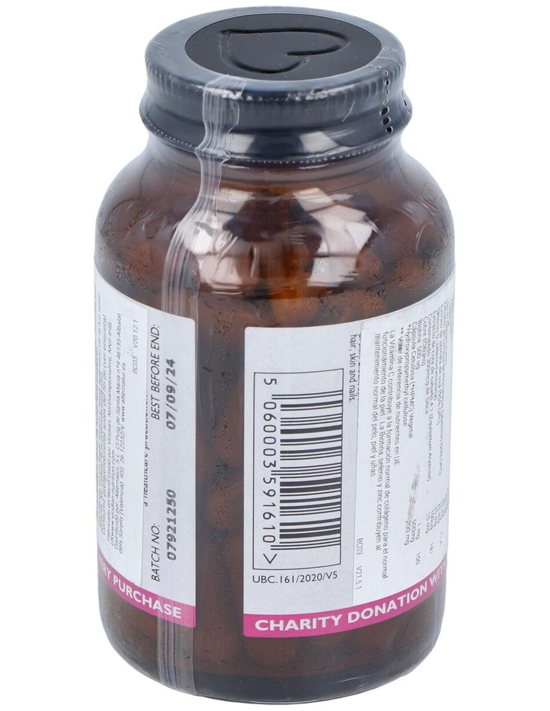 Complemento alimenticio en forma de cápsulas, elaborado a base de MSM, hierro, zinc, selenio y extractos de semilla de uva o cola de caballo, entre otros, que contribuye al mantenimiento saludable de piel, cabello y uñas.