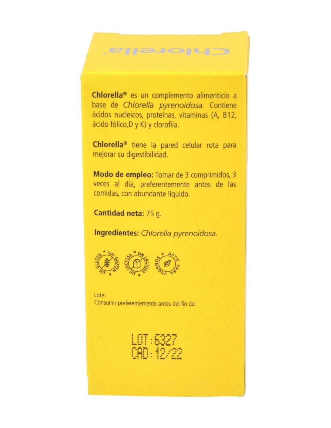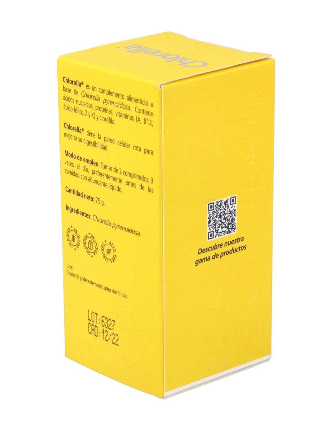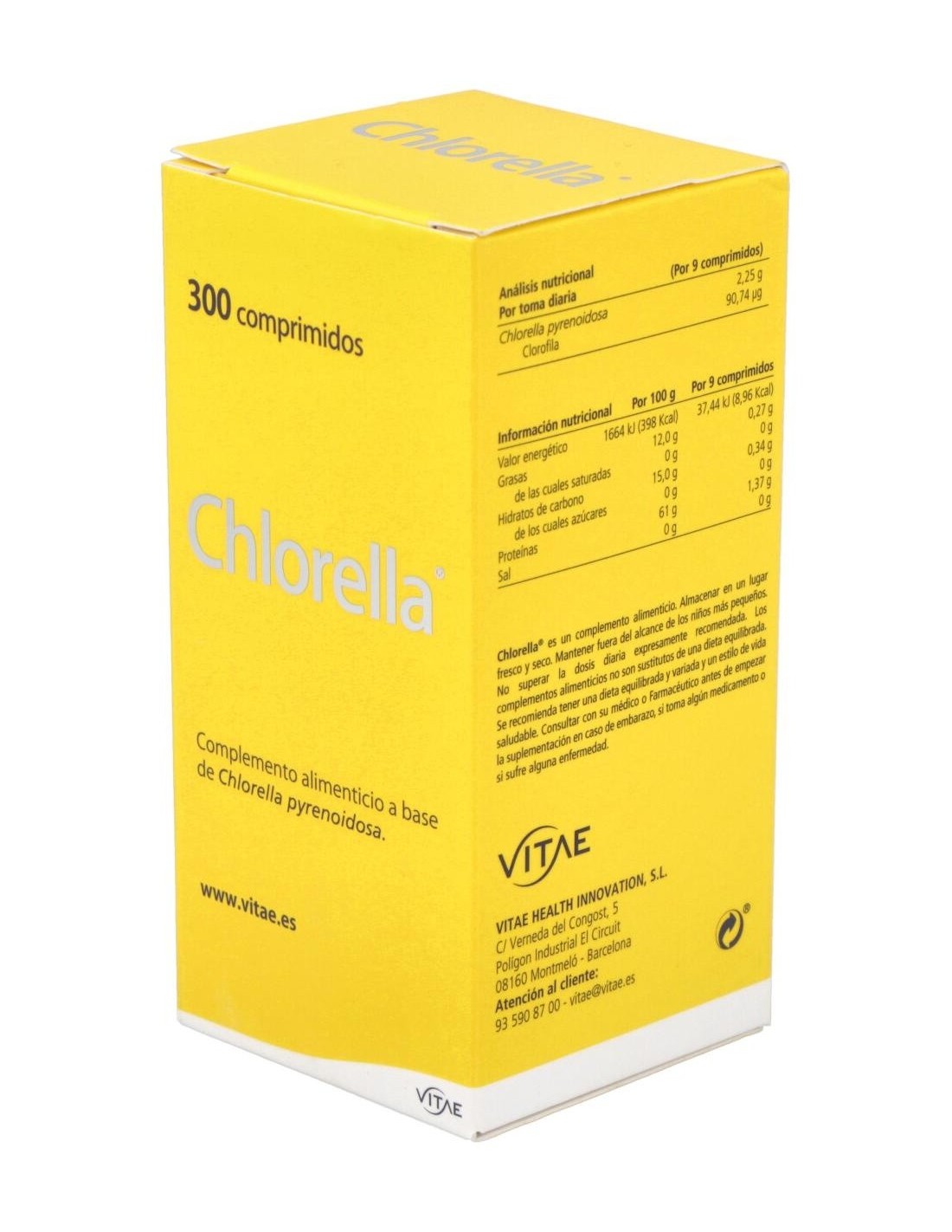 La Chlorella es una alga unicelular de agua dulce existente en la Tierra desde hace más de tres mil millones de años. El nombre de Chlorella proviene del griego chlor: color verde-amarillento y del latín ella: sufijo relativo a su pequeño tamaño. Los primeros estudios sobre esta alga fueron publicados a finales del siglo XIX. El biólogo holandés Néerlandais Beijerinck en 1890 fue el primer científico en identificarla y clasificarla. Contiene clorofila, proteínas, ácidos nucleicos y vitaminas, como la vitamina A que contribuye al metabolismo normal del hierro y la vitamina B12 que ayuda a disminuir el cansancio y la fatiga. La Chlorella pyrenoidosa de Chlorella presenta la pared celular rota. La Chlorella pyrenoidosa ayuda a excretar compuestos tóxicos del organismo, y ayuda a mantener la vitalidad y la actividad del organismo. Composición por 9 comprimidos:1,8 grs de chlorella pyrenoidosa. Modo de empleo:Tomar 3 comprimidos 3 veces al día, preferentemente con las comidas. Presentación:Envase de 300 comprimidos.